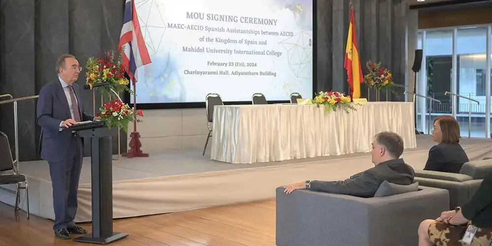 Prof. Chulathida Chomchai, M.D., MUIC Dean, signed the MOU on behalf of the college while H.E. Mr. Felipe de la Morena Casado, Spanish Ambassador to Thailand, signed on behalf of the Spanish Agency for International Cooperation and Development (AECID) on February 23, 2024 at Charinyarasami Hall in Aditayathorn Building.