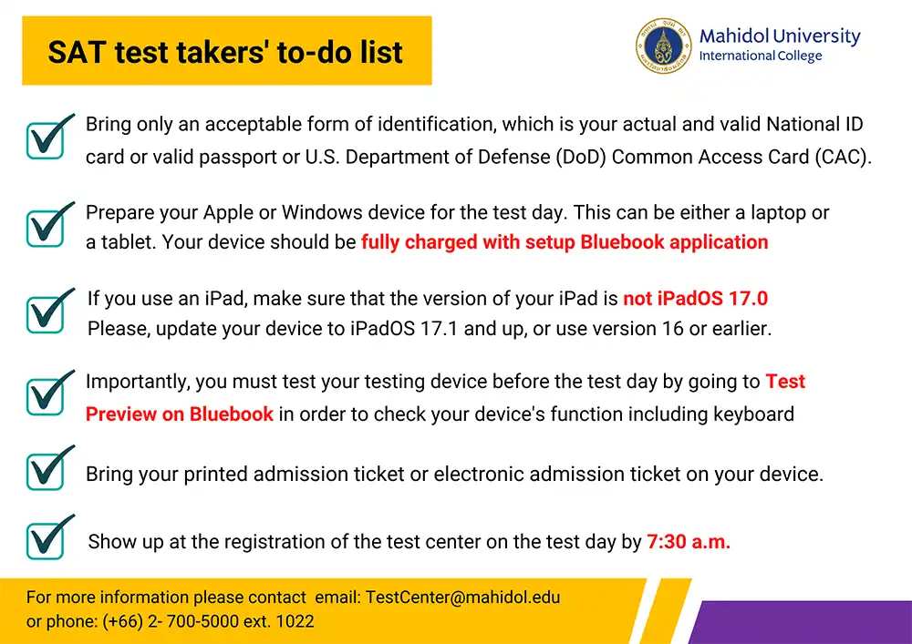 MUIC SAT test center will operate SAT on December 7, 2024. All test takers should show up at the registration by 7:30 a.m. with an actual and valid national ID card or valid passport or U.S. Department of Defense (DoD) Common Access Card (CAC). Also, you need to prepare an admission ticket or e-admission ticket for registration. Importantly, test takers have to bring fully charged devices with installed and set up the Bluebook application for testing.