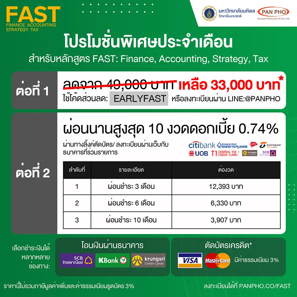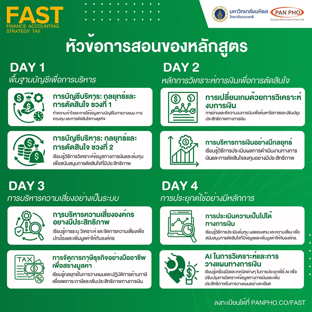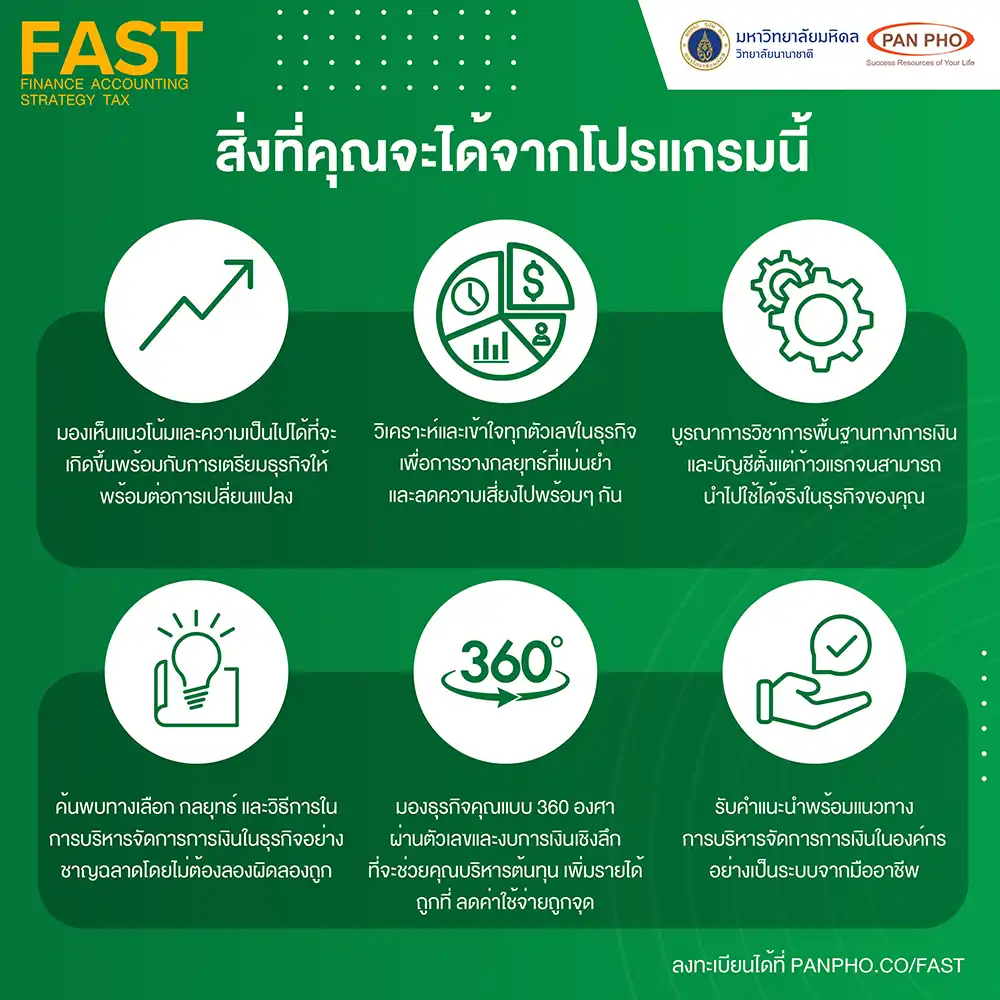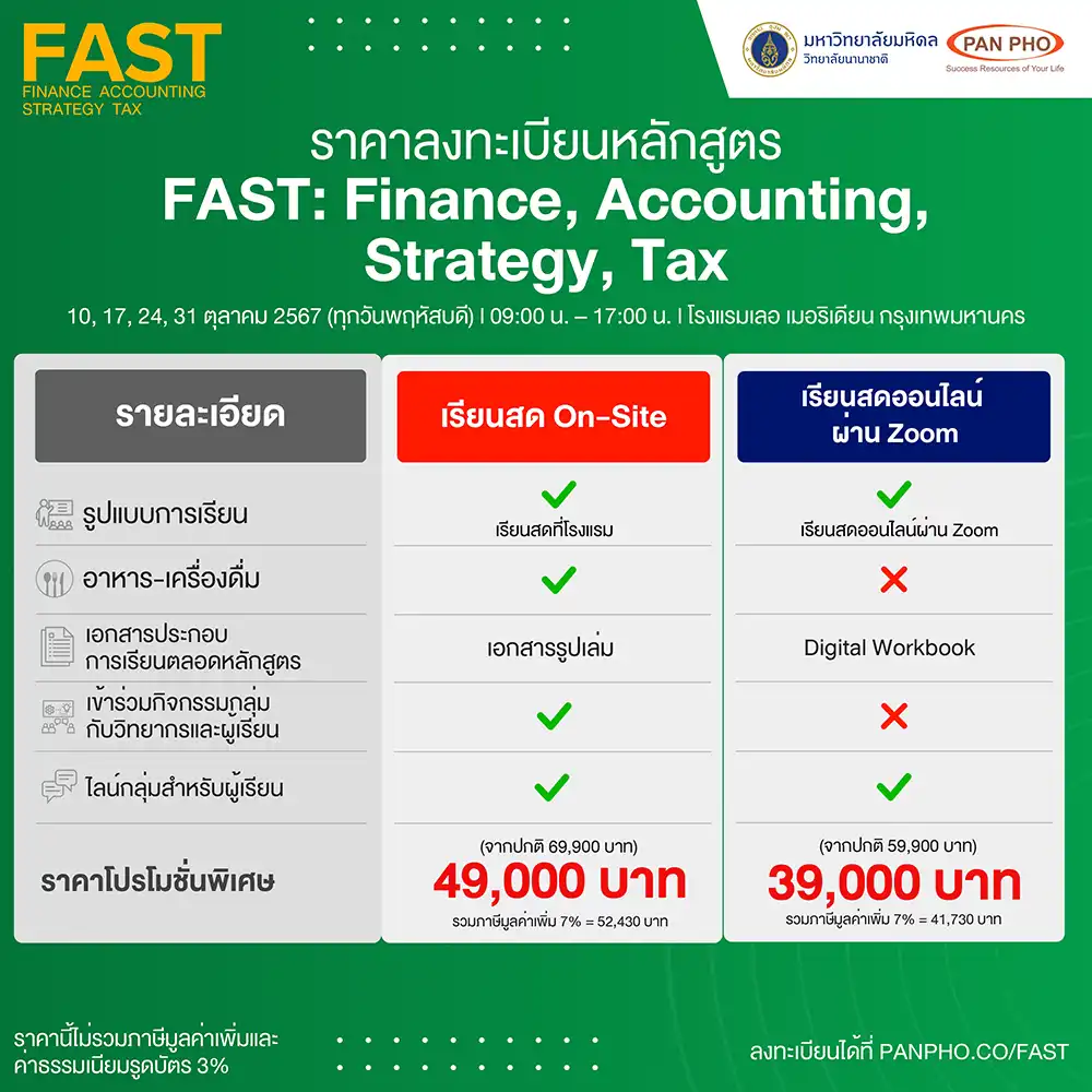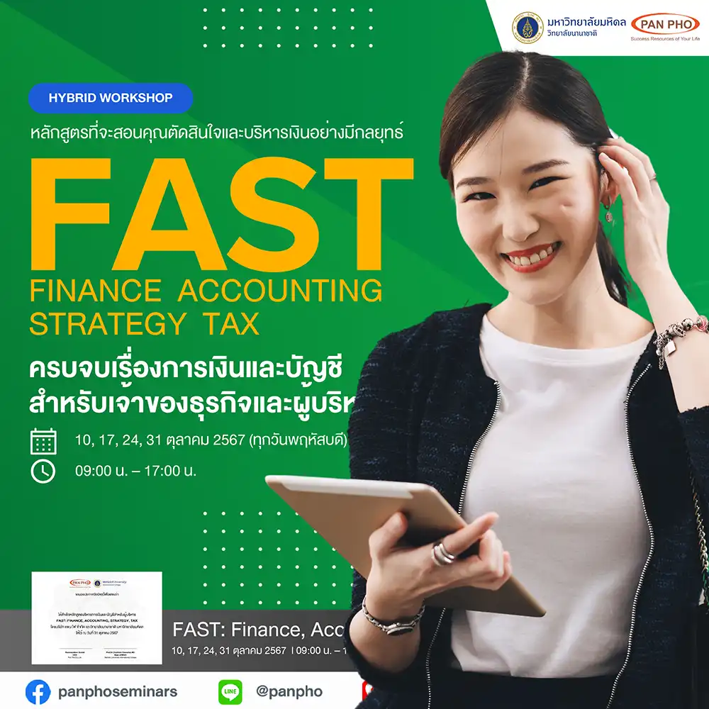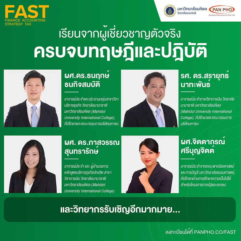 The FAST: Finance, Accounting, Strategy, Tax course is a 4-week program designed by Pan Pho Co., Ltd. and Mahidol University International College (MUIC). It delves into principles, thinking methods, and analysis both theoretically and practically, taught by experts from leading institutions and companies in Thailand. The content is distilled and arranged for easy understanding and practical application, even for those without a financial or accounting background.