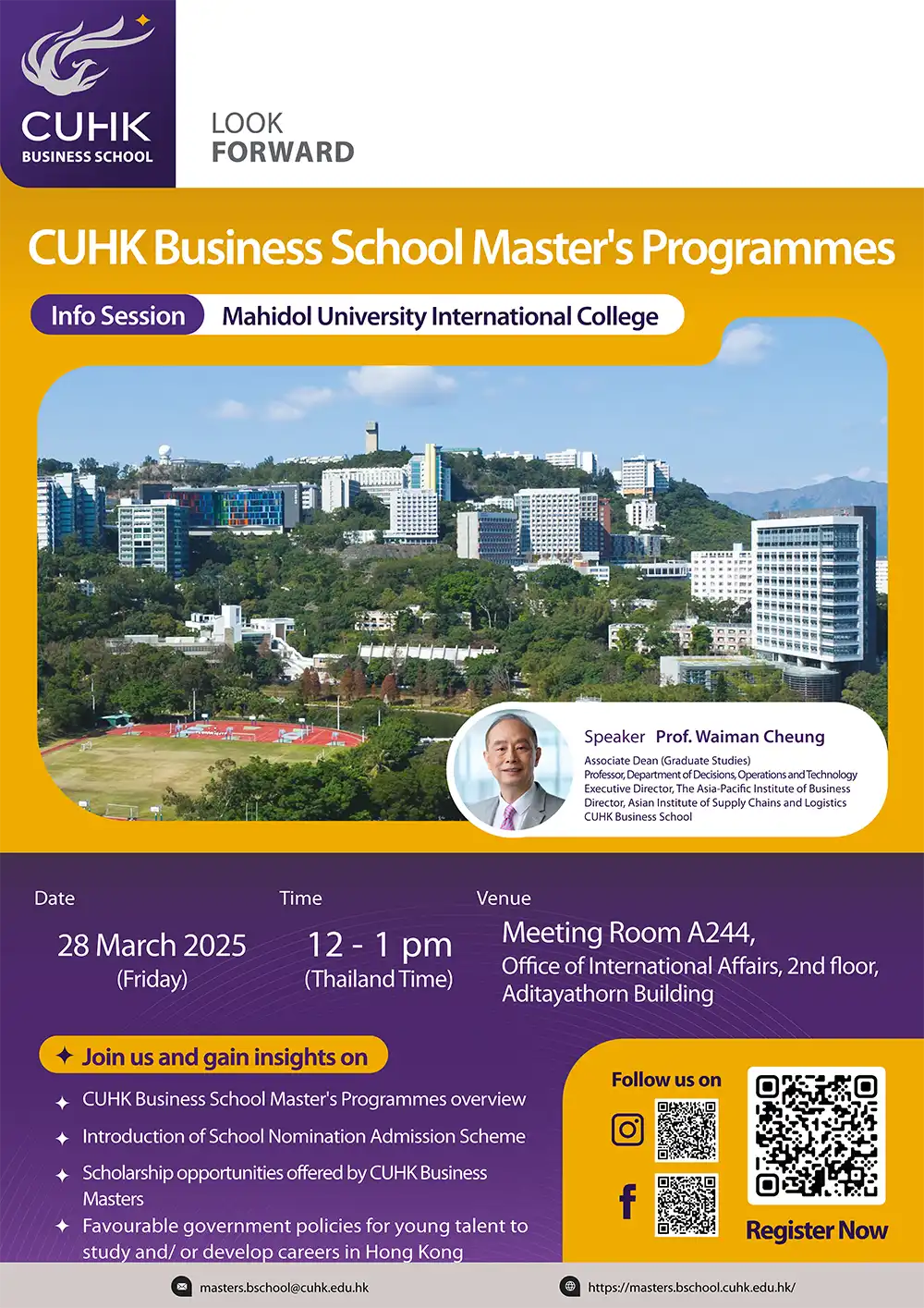 We are delighted to announce the CUHK Business School Master’s program and scholarship opportunity Information Session, which will be hosted on Friday 28, March 2025 at A244, Aditayathorn Building. You will have an opportunity to meet with Prof. Waiman Cheung, Associate Dean (Graduate Studies) Professor, Department of Decisions, Operations and Technology Executive Director. This unique opportunity will provide invaluable insights into the enriching experience of studying at CUHK Business School Master’s Programmes.