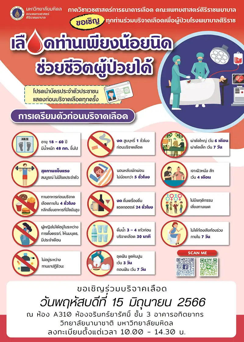 The MUIC Student Association and the Siriraj Hospital will organize a blood donation session on Thursday, June 15, 2023  The blood donation will be held at the Charinyarasami Hall, 3rd  floor MUIC Aditayathorn Building from 10.00 a.m. – 02.30 p.m.