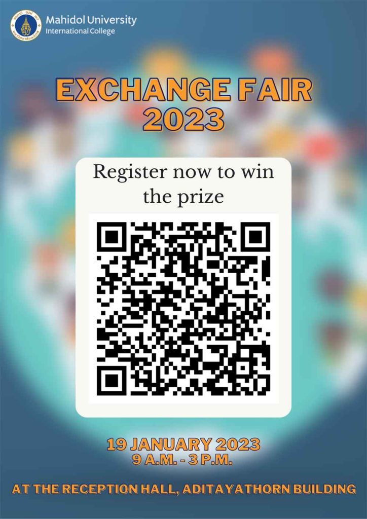 Student Exchange Unit is pleased to invite you all to join MUIC Exchange Fair 2023 on Thursday 19th of January 2023 at the reception hall, Aditayathorn Building from 9:00 A.M. – 15:00 P.M.