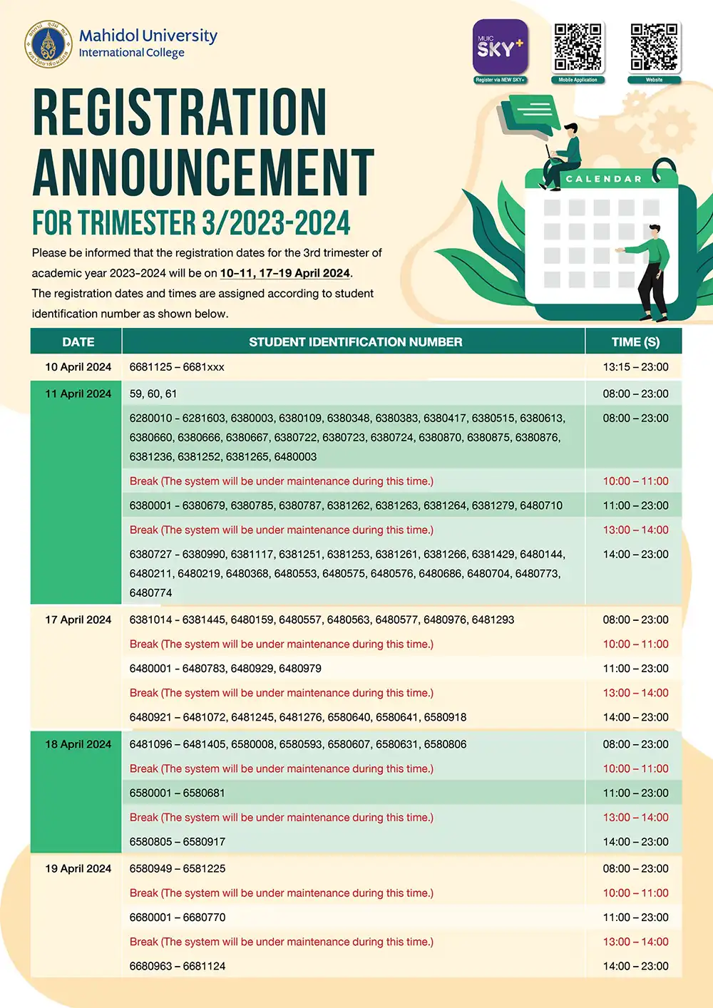 The registration dates and times are assigned according to student identification number as shown below.