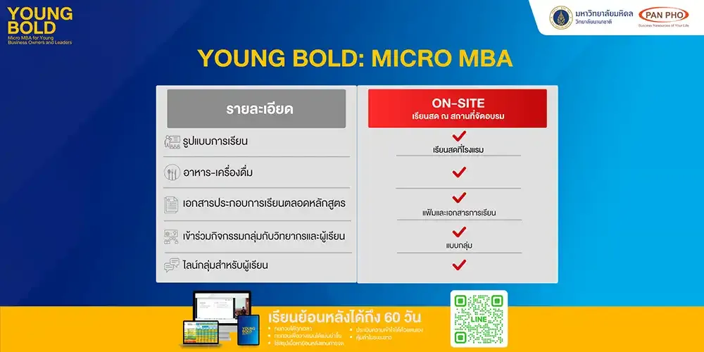 The YOUNG BOLD: MICRO-MBA course is an intensive 5-week program designed by Pan Pho Company Limited in collaboration with Mahidol University International College to prepare business owners and new-generation executives who want to build a foundation in business management to extend into competitive advantages in an uncertain world.