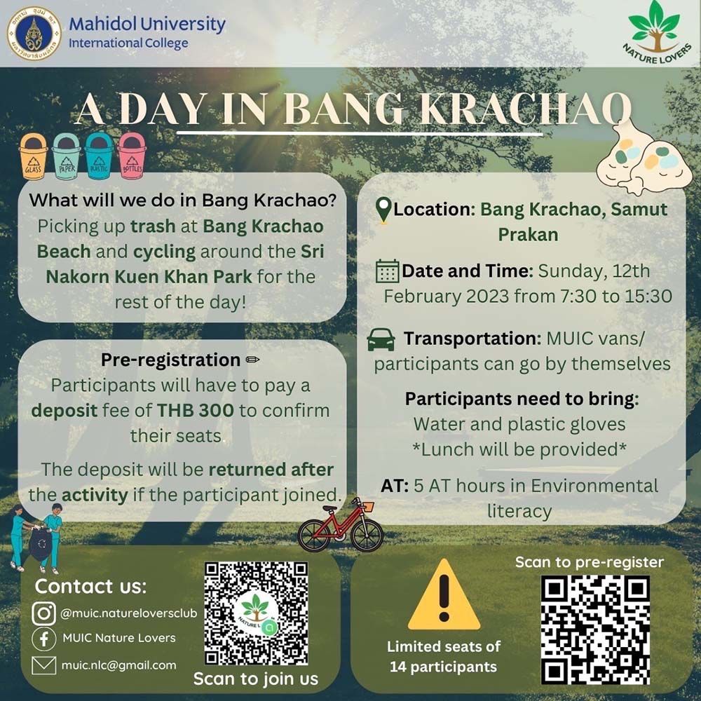 In this activity, participants will help clean the Bang Krachao Beach area and cycle around the Sri Nakhon Kuen Khan Park to explore the ecosystem at Bang Krachao.