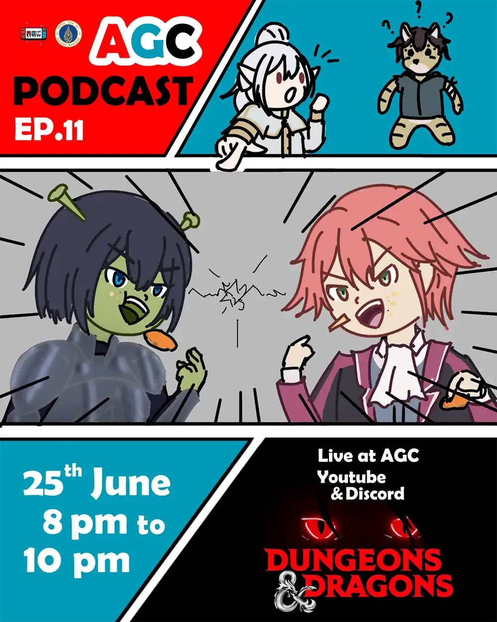 Starring the Five Staffs of the AGC Club as the hosts of this podcast, (Rin, Jorn, Dallas, Nicky and Boss), the broadcast doubles as a story for one to follow from start to finish in the form of a gameplay of the roleplaying game, where the narratives are decided by the DM (Dungeon Master) in this case being “Boss” who inserted himself as the God of Chaos within the vibrant world of the game.