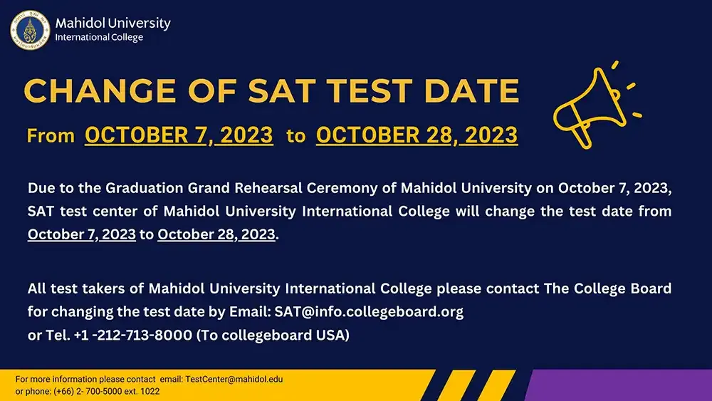 Due to the Graduation Grand Rehearsal Ceremony of Mahidol University on October 7, 2023, SAT test center of Mahidol University International College will change the test date from October 7, 2023 to October 28, 2023.