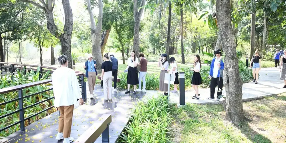 The activity began with a tram ride to Sireeruckhachati Nature Learning Park, where two expert speakers warmly welcomed everyone. The herbal garden tour was a sensory delight, as participants not only saw but also smelled and tasted various plants which are closely linked to Thai cuisine and traditional medicine. The speakers shared fascinating facts, enhancing the students’ understanding of local flora.