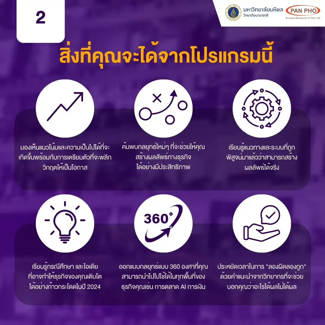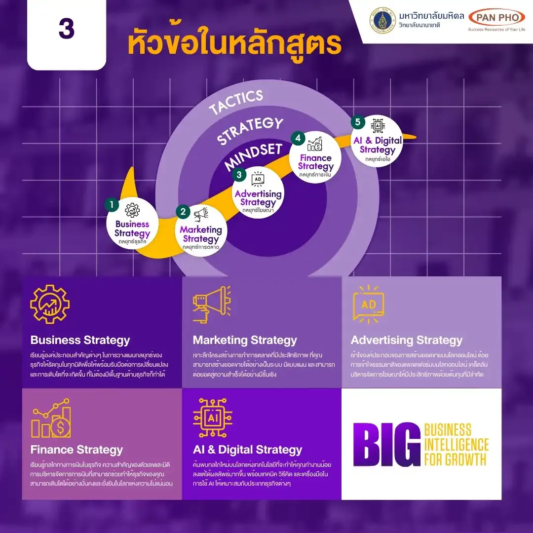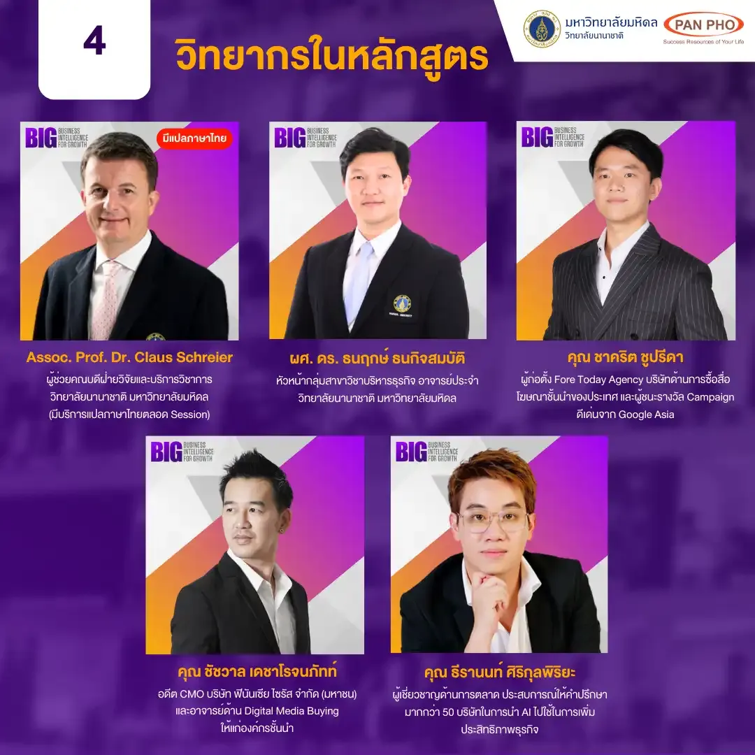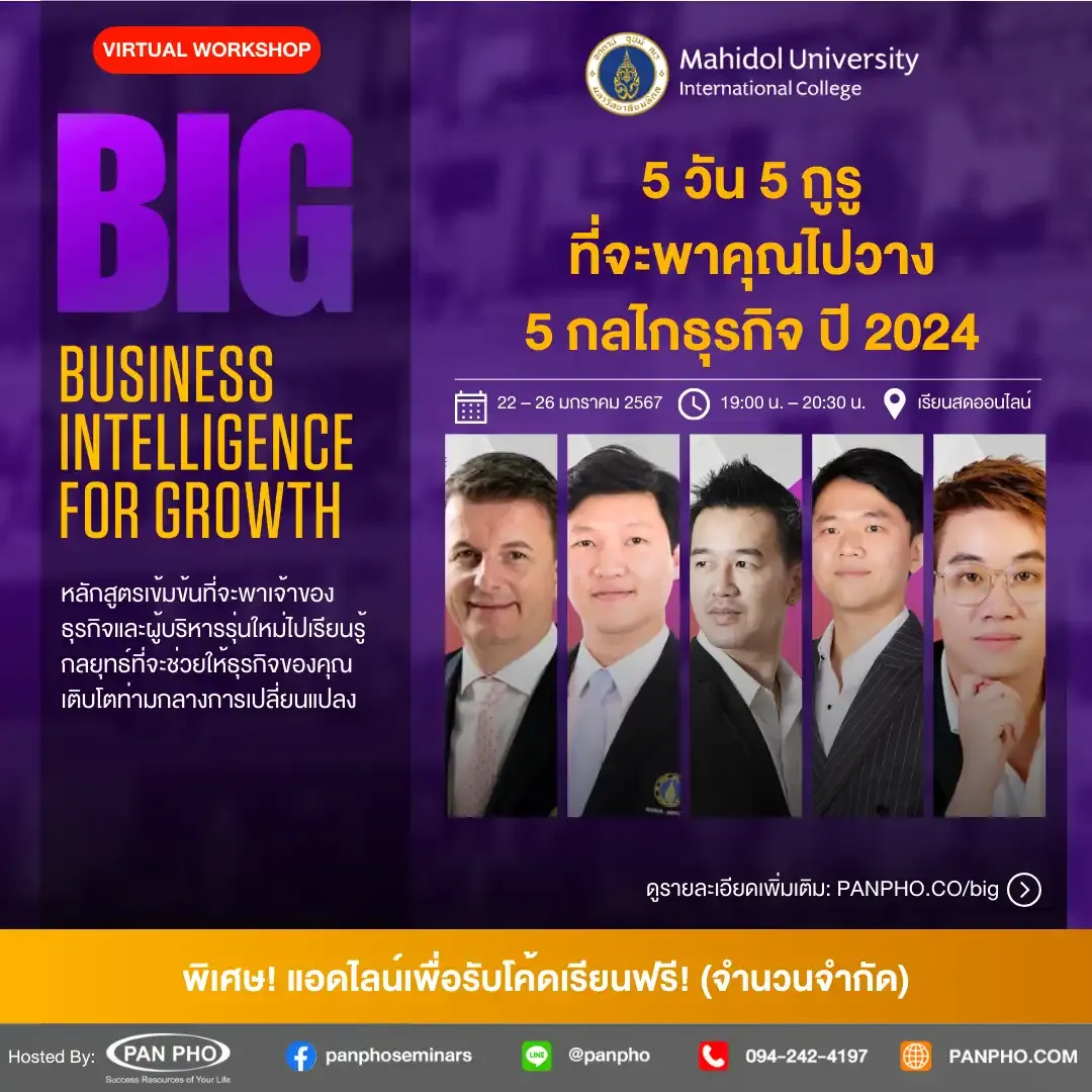 The BIG: Business Intelligence for Growth short course is scheduled from Monday to Friday, February 22-26, 2024, via Zoom, from 19:00 to 20:30. The registration fee of 2,500 baht covers VIP ticket virtual attendance (live online classes). Free registration for this course is available; learn through a Private Facebook group and receive a code to apply for the free course by adding Line: @Panpho. Enroll today at panpho.co/BIG, and please note that availability is limited to 30 participants per year.”