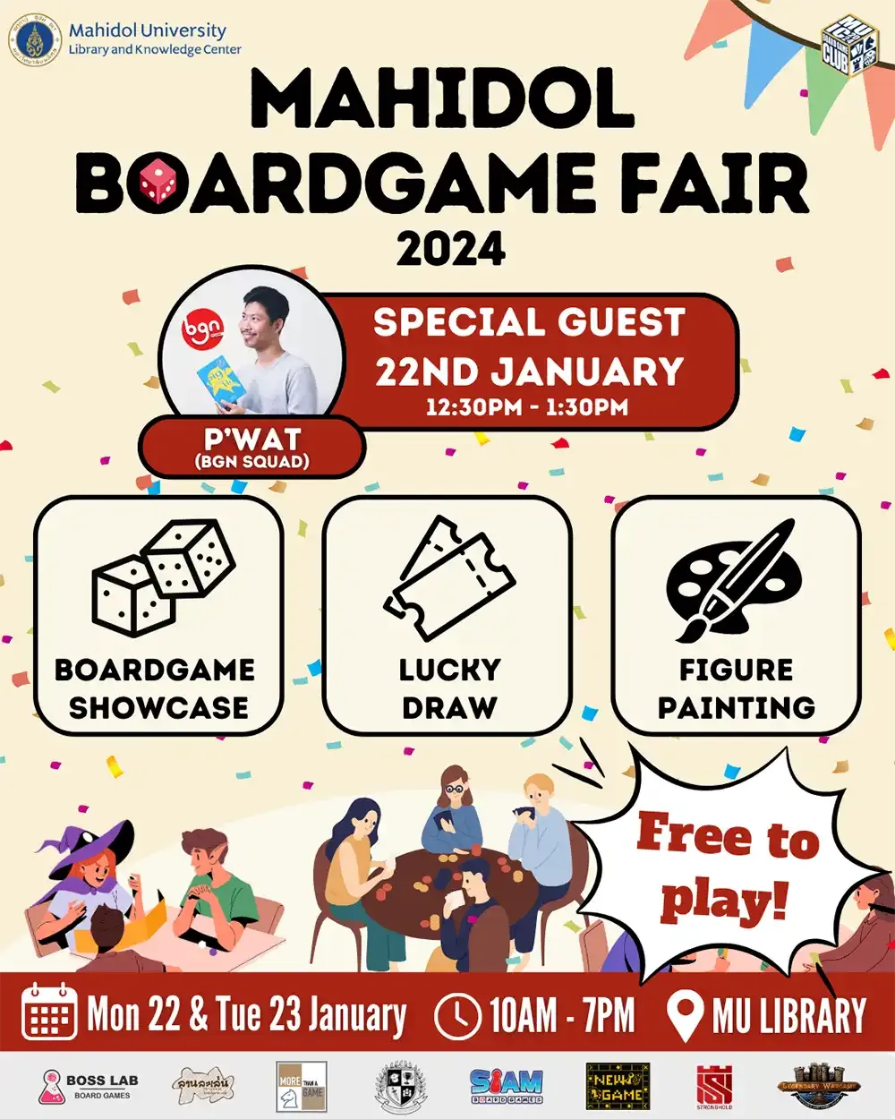 Held on January 22 - 23, 2024 at MU Co-working Space, several board game shops including Lan La Len, More Than a Game, Boss Lab, Siam Board Games, Legendary Wargame, Board Game Academy, The Stronghold, and New Game Entertainment put up stalls and introduced their services and products. They also gave the students the chance to try out their newest board games. Moreover, for this event, they also provided discounted prices especially for Mahidol University students.