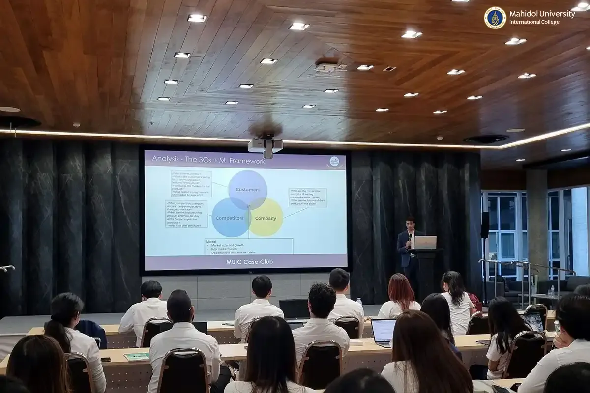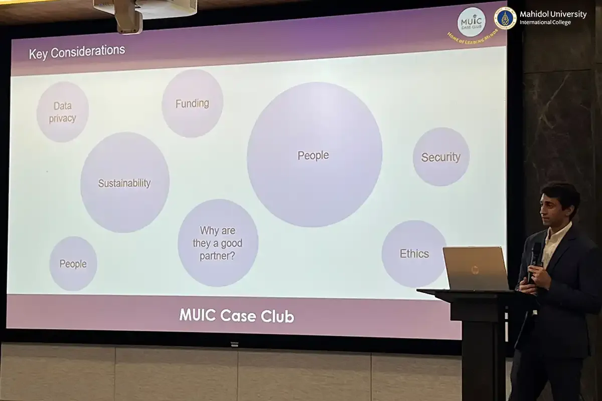 Mahidol University International College’s (MUIC) Case Club hosted a strategy training session led by Mr. Parth Shah, Senior Associate at AWR Lloyd, who was the former Case Club President and an accomplished alumnus with a wide experience in case competitions. Mr. Shah offered club members valuable insights regarding unfolding a case study whilst presenting it at Charinyarasami Hall, 3rd Floor, Aditayathorn Building on December 3, 2024.