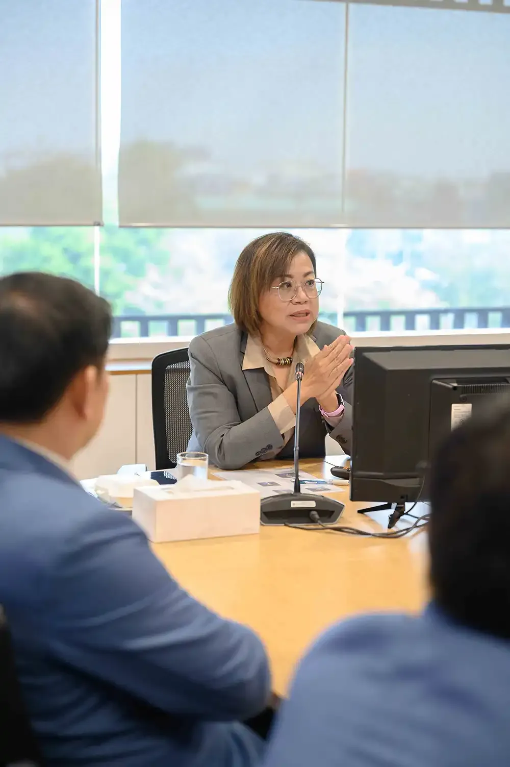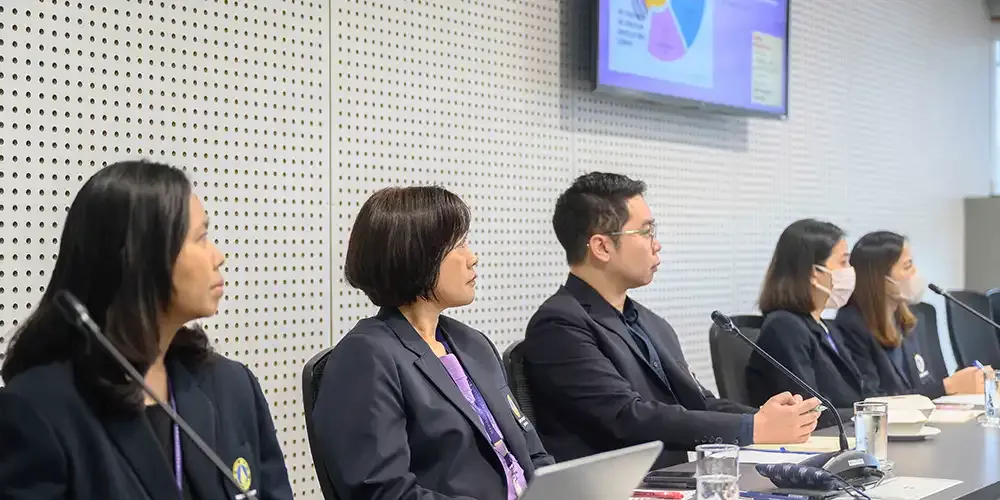 Prof. Chulathida Chomchai, M.D., MUIC Dean, was accompanied by several college executives along with staff from the Planning, Monitoring & Evaluation Section. They had discussions with the visitors about key performance indicators (KPIs) in the international level for full-time faculty members and students. The two groups also discussed other topics that were of interest to their respective institutions.