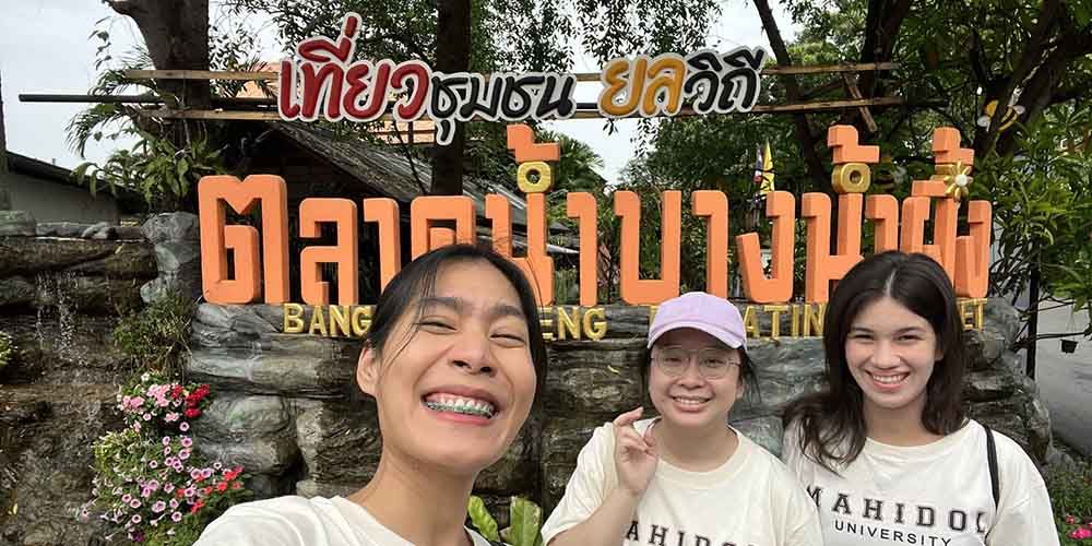 The cyclists, comprising 16 students and one lecturer, first went to Bang Nam Pheung Floating Market to have brunch. Afterwards, they went to Sri Nakhon Khuean Khan Park where they rented bicycles which they can use to travel around the island.