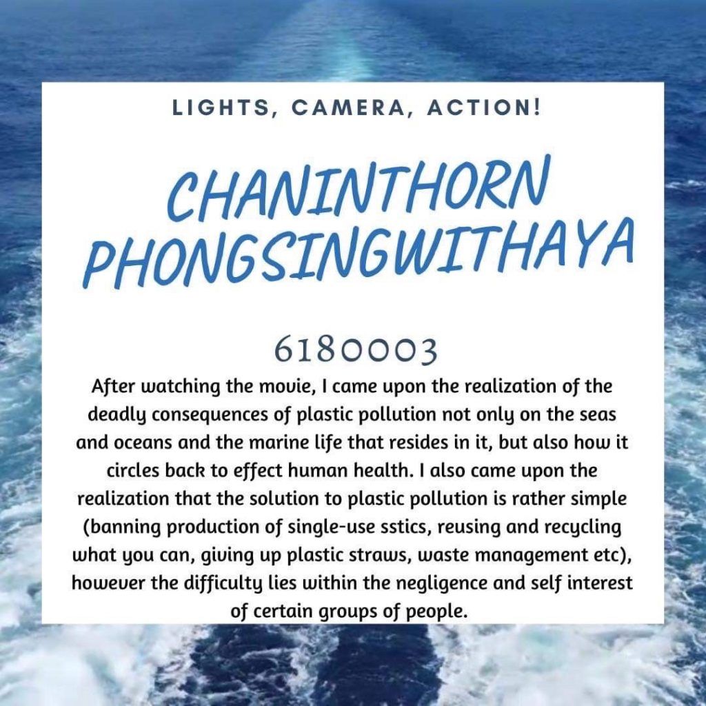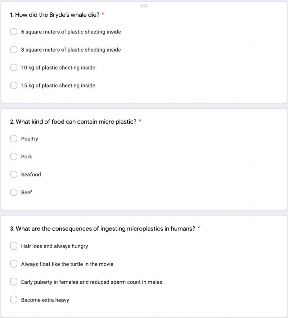 Participants were asked to watch a documentary film available on Netflix called “A Plastic Ocean” and at the end of the week answer questions related to the movie and the concept of “Plastic Pollution.”