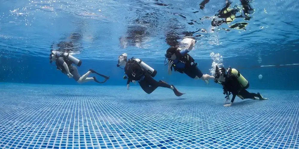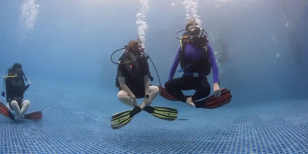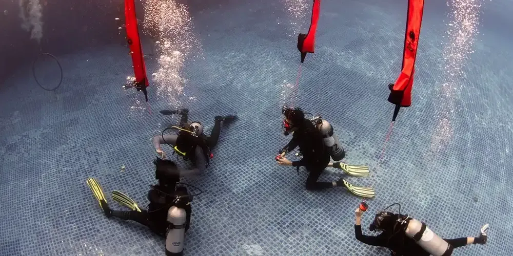 Within the pool's controlled environment, participants had the opportunity to practice a set of crucial skills. This included assembling dive equipment, donning the gear using proper techniques, conducting buoyancy checks at the surface, inflating/deflating the BCD (Buoyancy Control Device) on the surface, adopting proper breathing patterns, and maintaining buoyancy while swimming, among other vital skills. Additionally, participants practiced the giant stride entry into the scuba diving pool, which simulated a 5-meter depth, preparing them for the real giant stride entry from a boat.