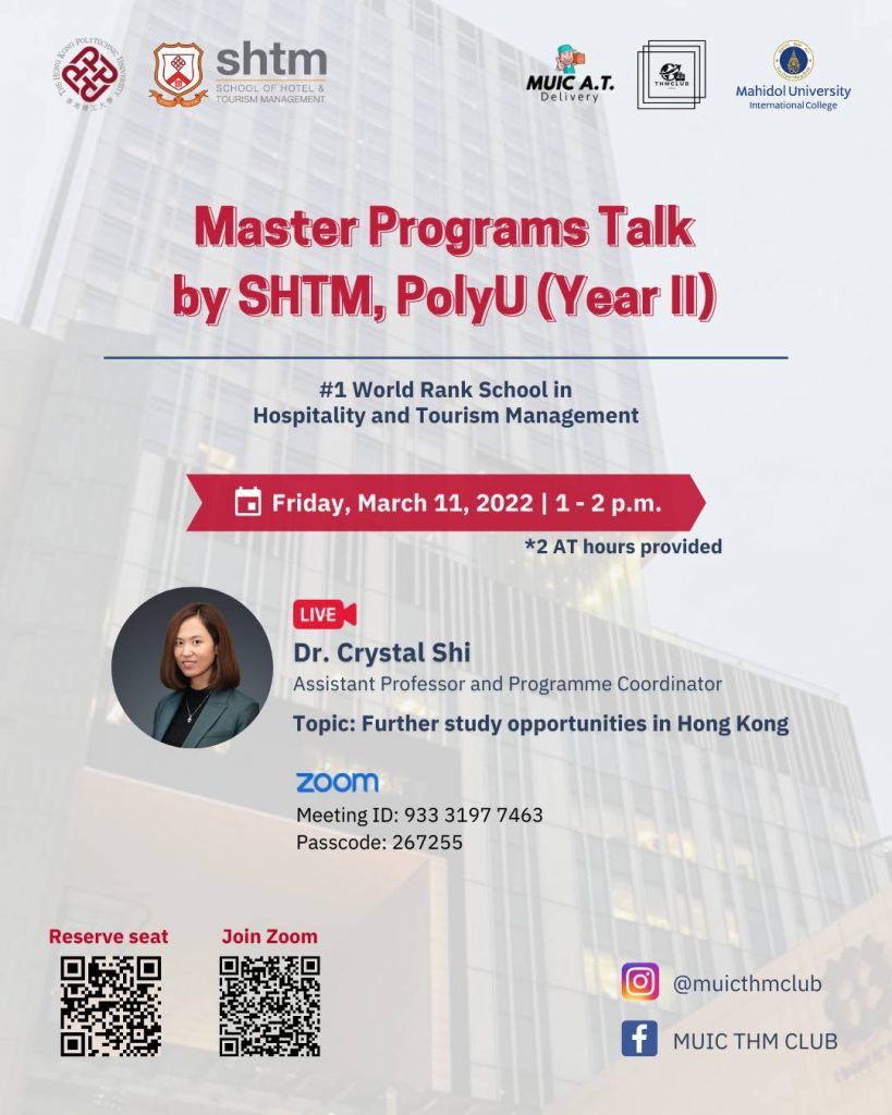 The International Affairs Office in cooperation with THM Club are pleased to invite you to join a webinar session about “further study opportunities in Hong Kong” provided by Dr. Crystal Shi, Assistant Professor and Program Coordinator, School of Hotel and Tourism Management (SHTM) at The Hong Kong Polytechnic University, Hong Kong on Friday 11th March from 1 to 2 pm (Thailand time)
