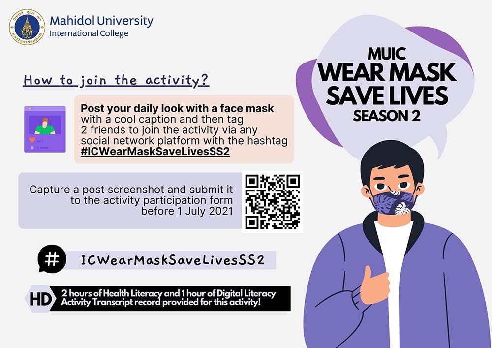 The Office of Student Affairs, Mahidol University International College organizes "IC Wear Mask Save Lives Season 2" to raise awareness of social responsibility by wearing a mask when in public. And we would like to invite all of our students to join the activity by following the below instruction.