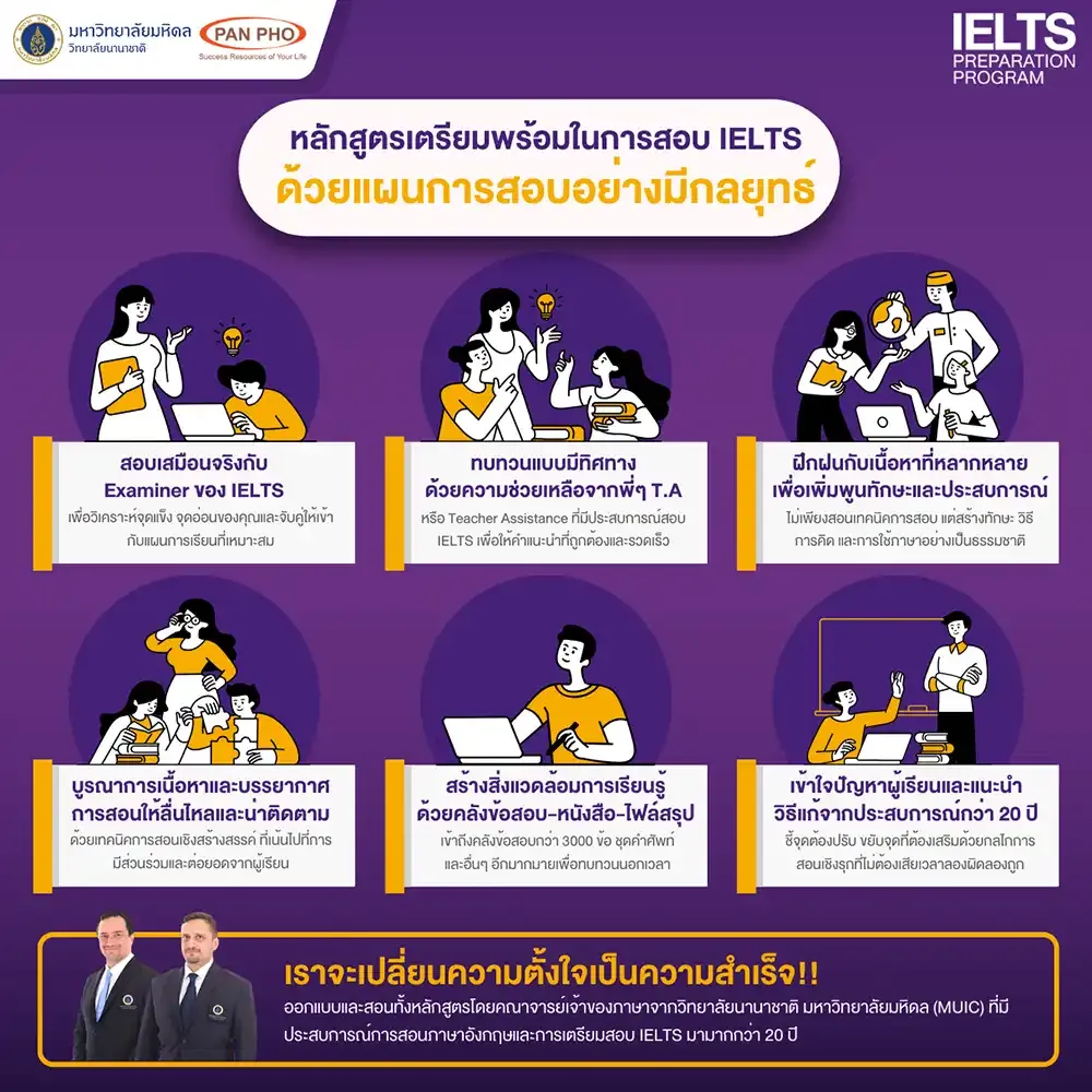 Recognizing the importance of English language knowledge for the IELTS exam, Pan Pho Company Limited and Mahidol University International College have jointly organized and developed the IELTS Preparation Program (IPP) to provide academic services and prepare individuals to take the exam strategically and develop English language skills dynamically.