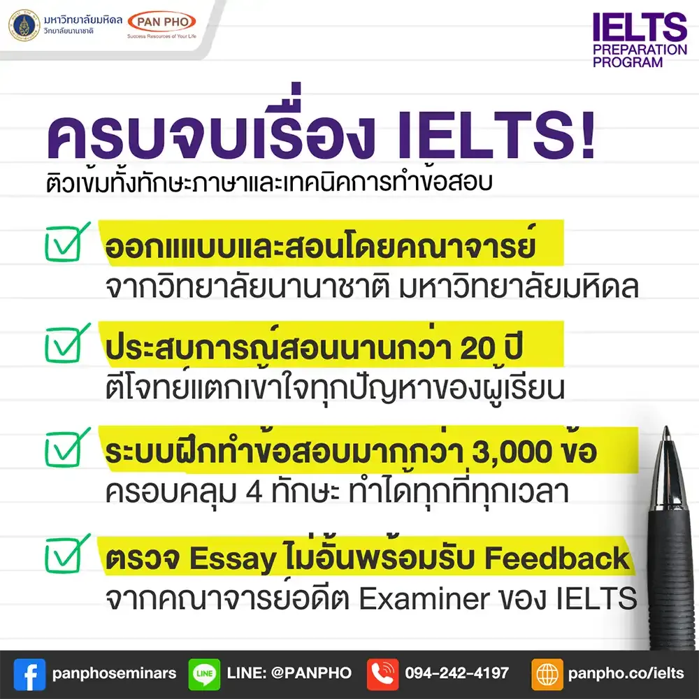 Hurry! Seats are limited. Interested individuals can apply and pay for the course today through the website: www.panpho.co/ielts or via LINE: @PANPHO (24 hours) or 094-242-4197.