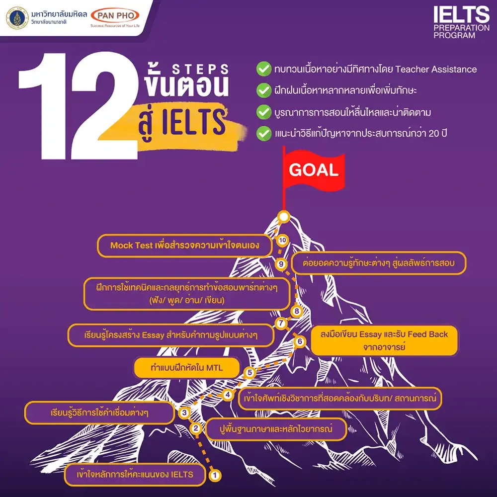 The IELTS Preparation Program (IPP) is a 50 Hours course designed by Pan Pho Company Limited and Mahidol University International College (MUIC) to prepare you for the IELTS (International English Language Testing System) exam, which is an English language proficiency test recognized by leading educational institutions worldwide.