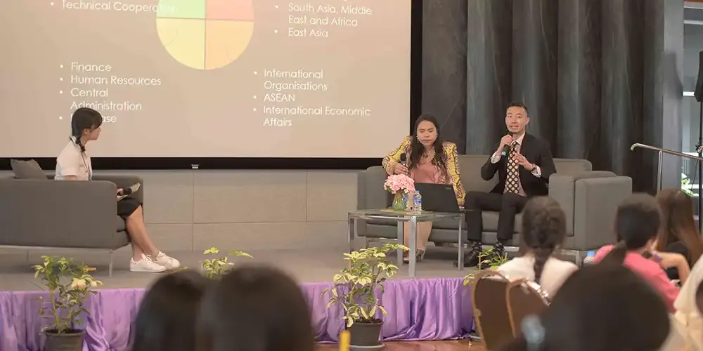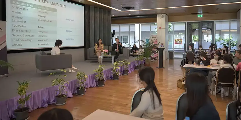 Four diplomats from the Ministry of Foreign Affairs (MFA), Thailand, one of whom is an MUIC alumnus, were the guest speakers. They are: