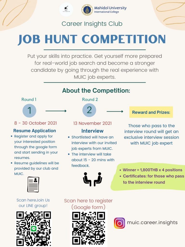 It is very important for you to join our special Line group for ‘Job Hunt’ to keep yourself updated. More information about this activity will also be in the job hunt Line group as well.