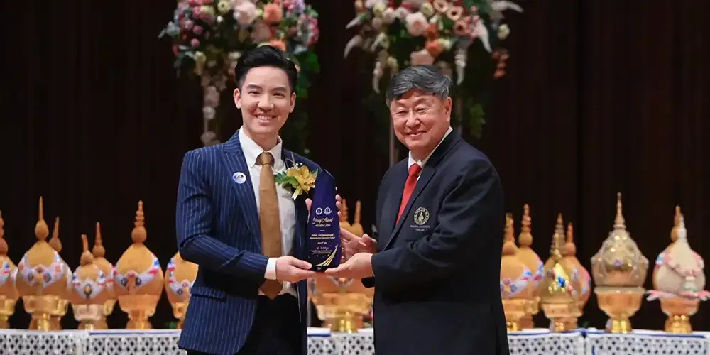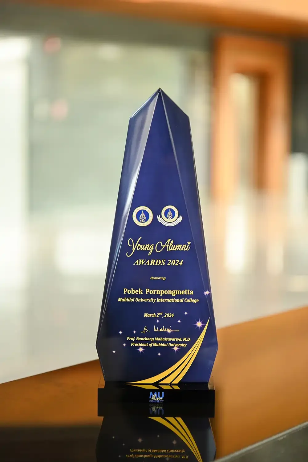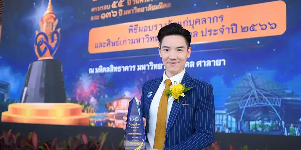 Mr. Pobek Pornpongmetta (Class of 2014) received the award from Prof. Banchong Mahaisavariya, M.D., President of Mahidol University, on March 2, 2024 on the occasion of Mahidol University’s “55th Anniversary of the Royal’s Bestowal of its Name and the 136th Year Commemoration” held at Prince Mahidol Hall in Mahidol University’s Salaya Campus.
