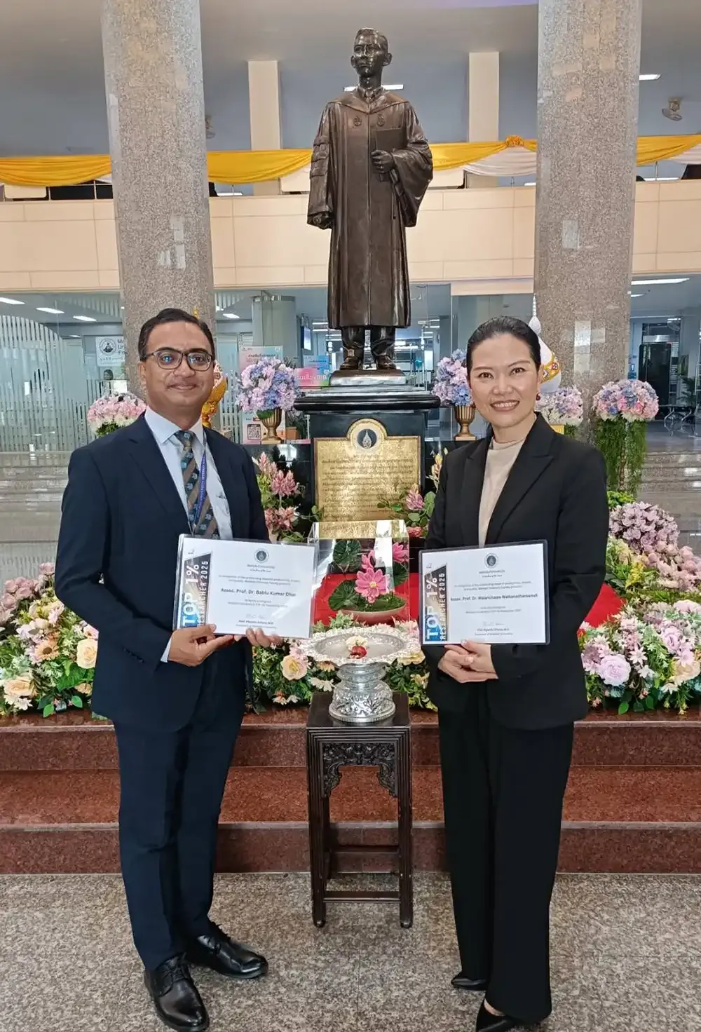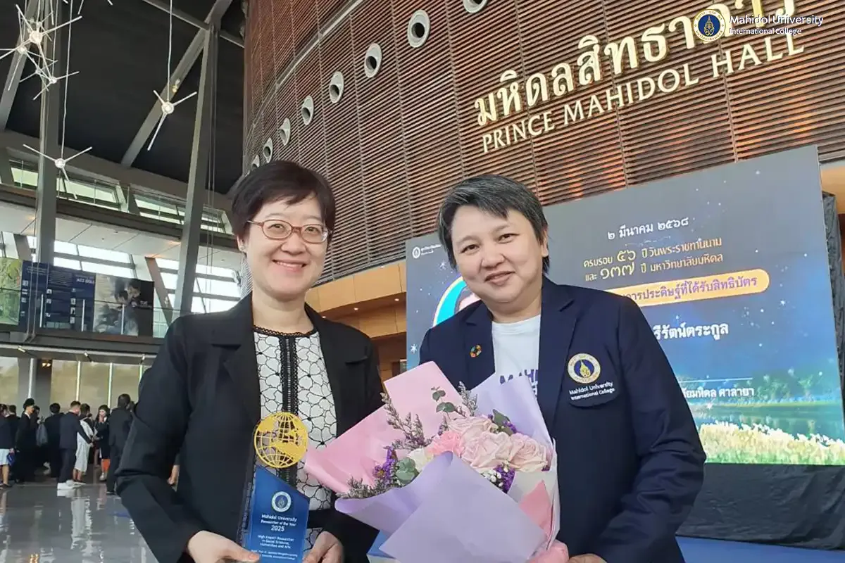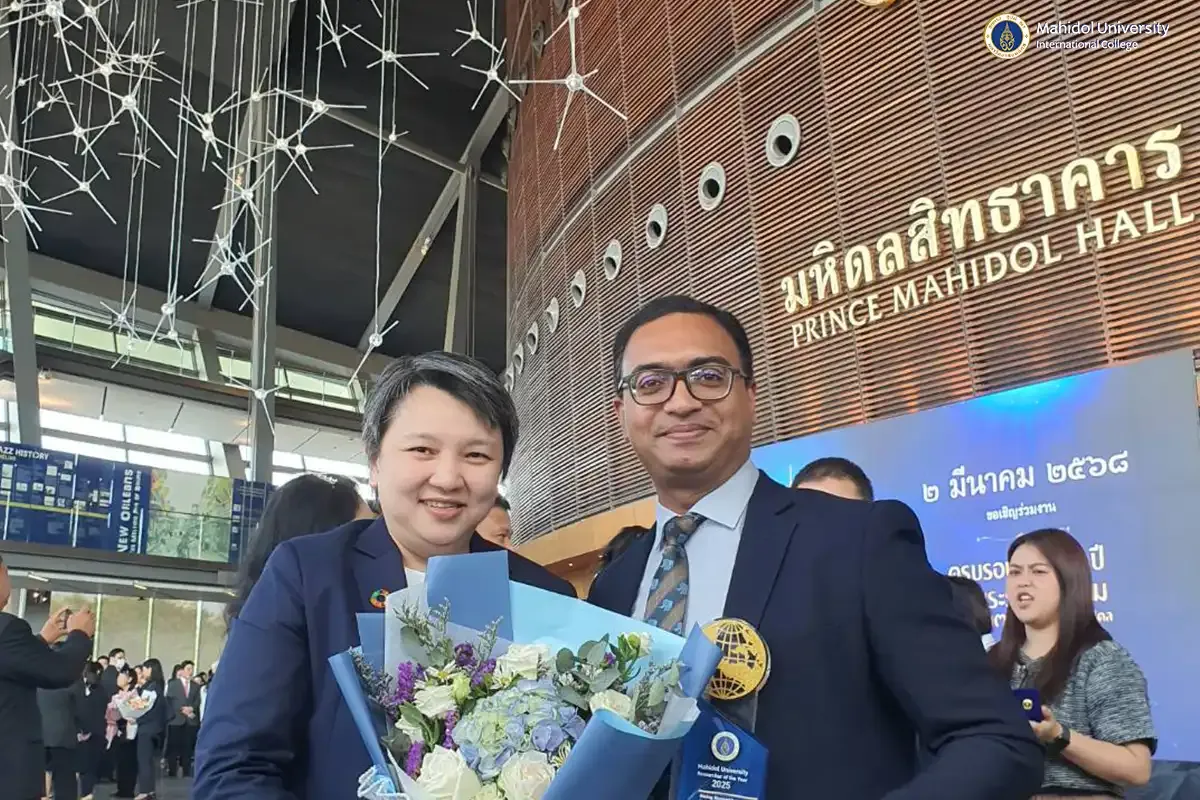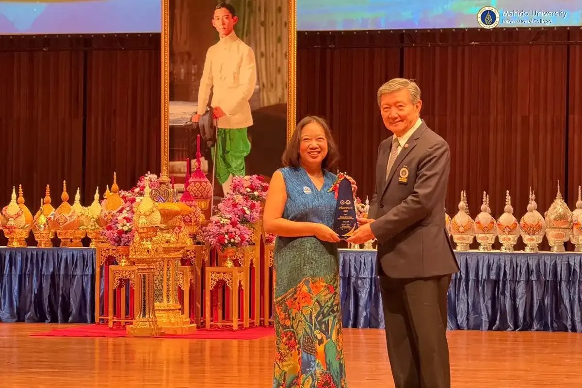 - Another activity was the Presentation Ceremony of Mahidol University’s Honorary Awards and Pins. Dr. Laddawan Jianvittayakit, Associate Dean for Environment and Sustainable Development of MUIC, and Dr. Prateep Wongverayut, Associate Dean for Administration, on behalf of the Dean, presented flowers to express congratulations to both researchers and alumni awardees.