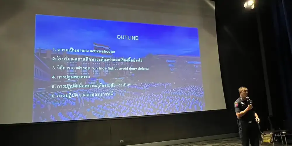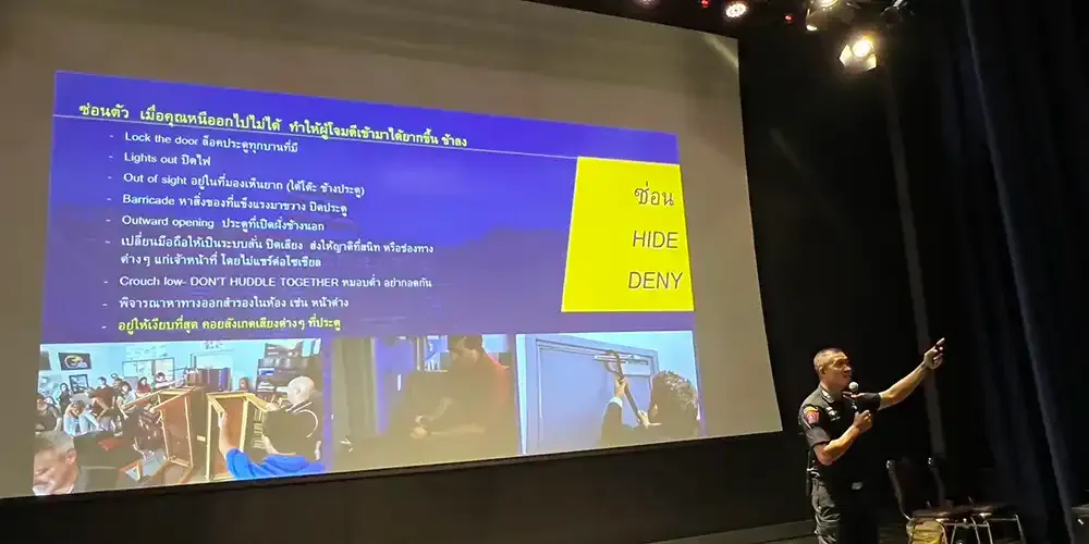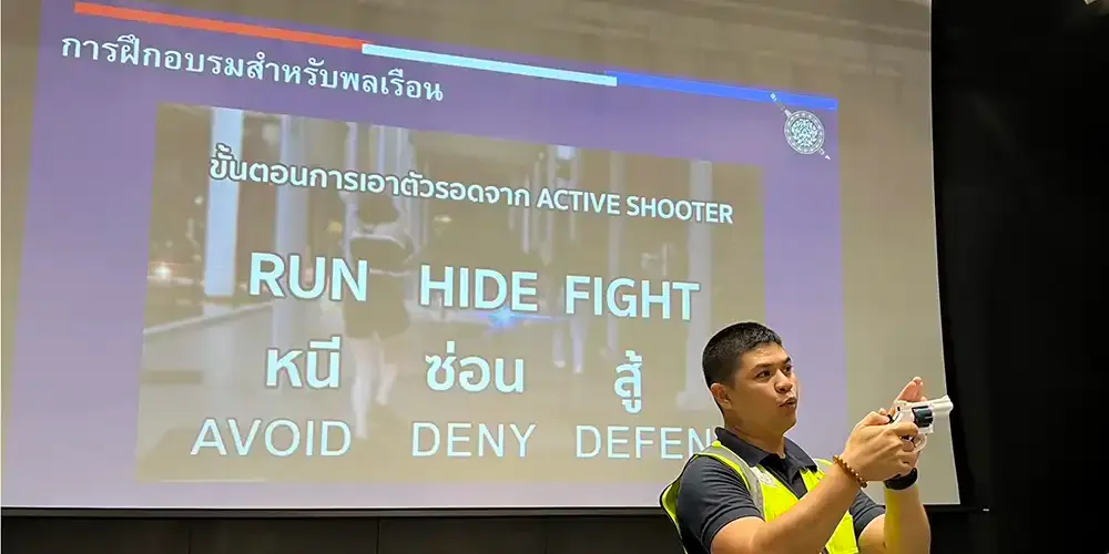 Representatives from the Royal Thai Police, Patrol and Special Operation Division, S.W.A.T. (Arintaraj26), and Tourist Police Bureau served as trainers to the 250 participants.