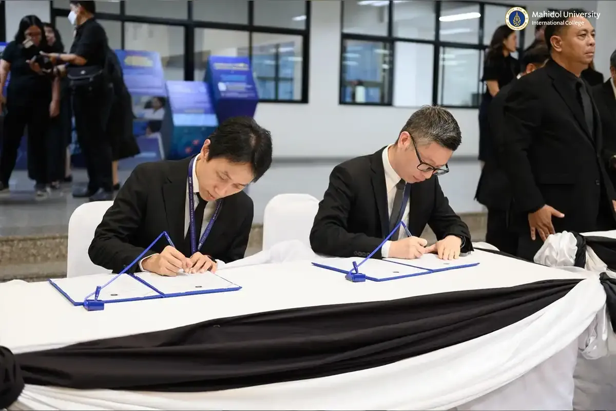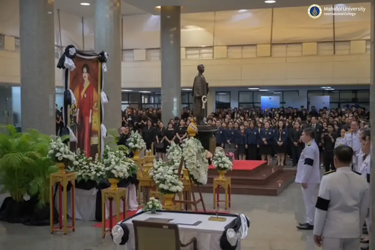 Mahidol University International College (MUIC) executives, led by Assoc. Prof. Dr. Yingyot Chiaravutthi, Associate Dean, attended the Ceremony to Express Condolences and Pay Tribute in Remembrance of Her Majesty Queen Sirikit The Queen Mother’s Gracious Benevolence at 1:00 pm on October 27, 2025 at the 1st Floor of the Office of the President, Mahidol University, Salaya campus.