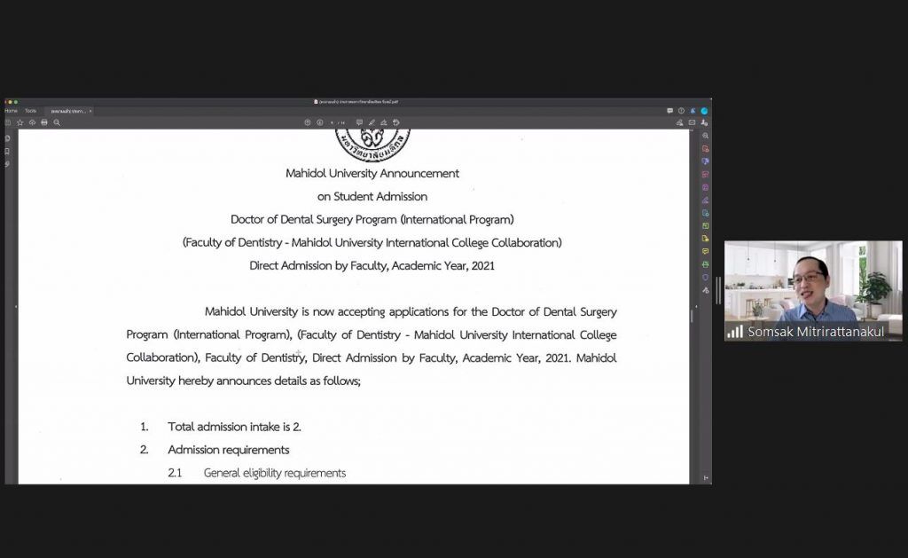 Assoc. Prof. Chulathida Chomchai, M.D., MUIC Dean, and Assoc. Prof. Dr. Somsak Mitriattanakul from the Faculty of Dentistry, Mahidol University, gave an introduction and shared information about a Direct Admission to the Doctor of Dental Surgery Program (International Program), a new collaboration between the Faculty of Dentistry and MUIC starting on Academic Year 2021-22.