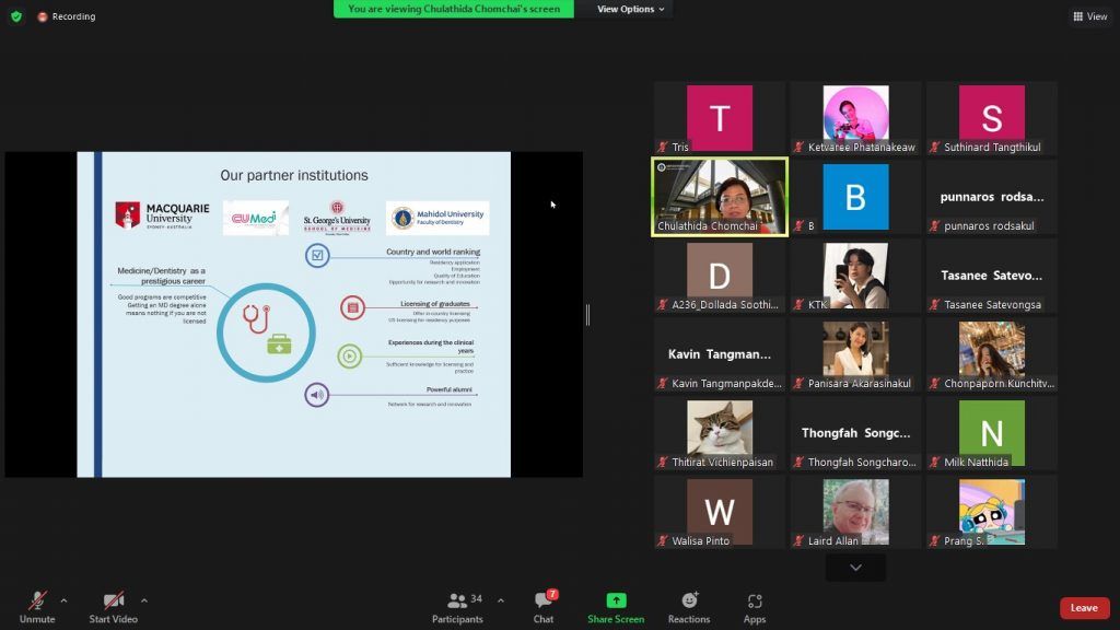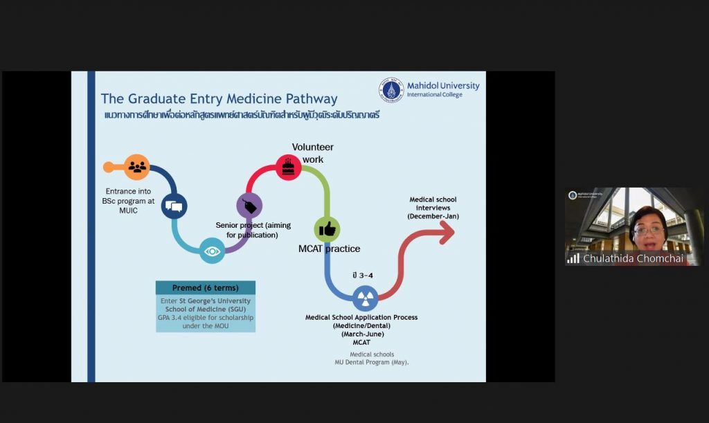 The Science Division of Mahidol University International College (MUIC) held an online “Group Talk on Opportunities in Medicine, Dentistry, and Beyond for MUIC Bio Grads” via Zoom on August 19, 2021.