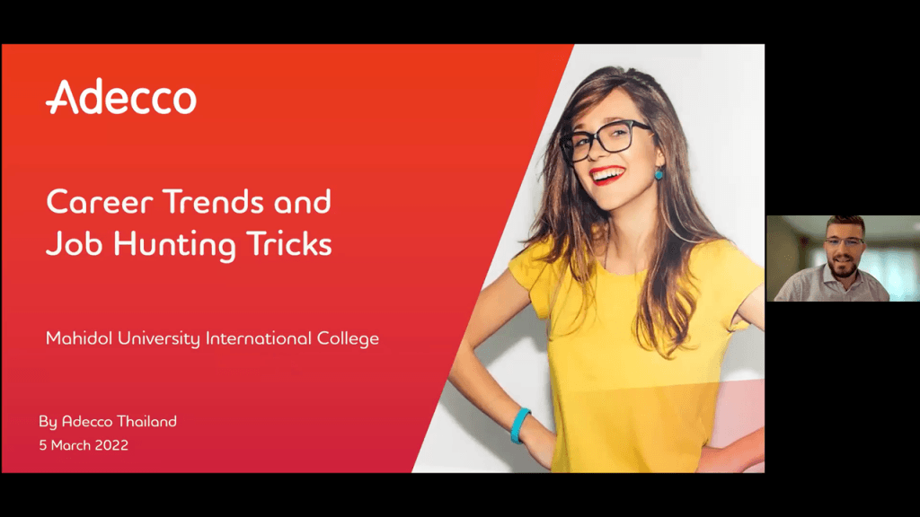 The event has two sessions. Session 1 featured “Job Hunting Tricks During the Crisis” with Mr. Ashley Alcock, Director, Adecco Recruitment (Thailand) Ltd. as guest speaker; while Session 2: Career Talks featured alumni guest speakers from the various divisions, with students choosing to attend the session matching their respective major.