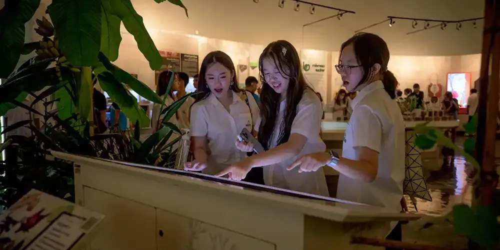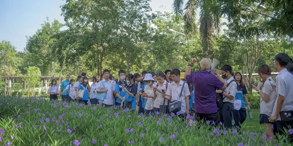 In the morning of October 24, the 286 students and 10 of their teachers were brought to Sireeruckhachati Nature Learning Park inside the MU Salaya campus for the first part of “Biosynergy 2023.” Prof. Chulathida Chomchai, MD, MUIC Dean, and Assoc. Prof. Dr. Wariya Chinwanno, MUIDS School Director, gave the welcoming remarks. Ajarn Laird and his team then gave the students a guided tour and also facilitated talks on biodiversity values, Thai traditional herbal medicine, and the multisensory plant aesthetics.