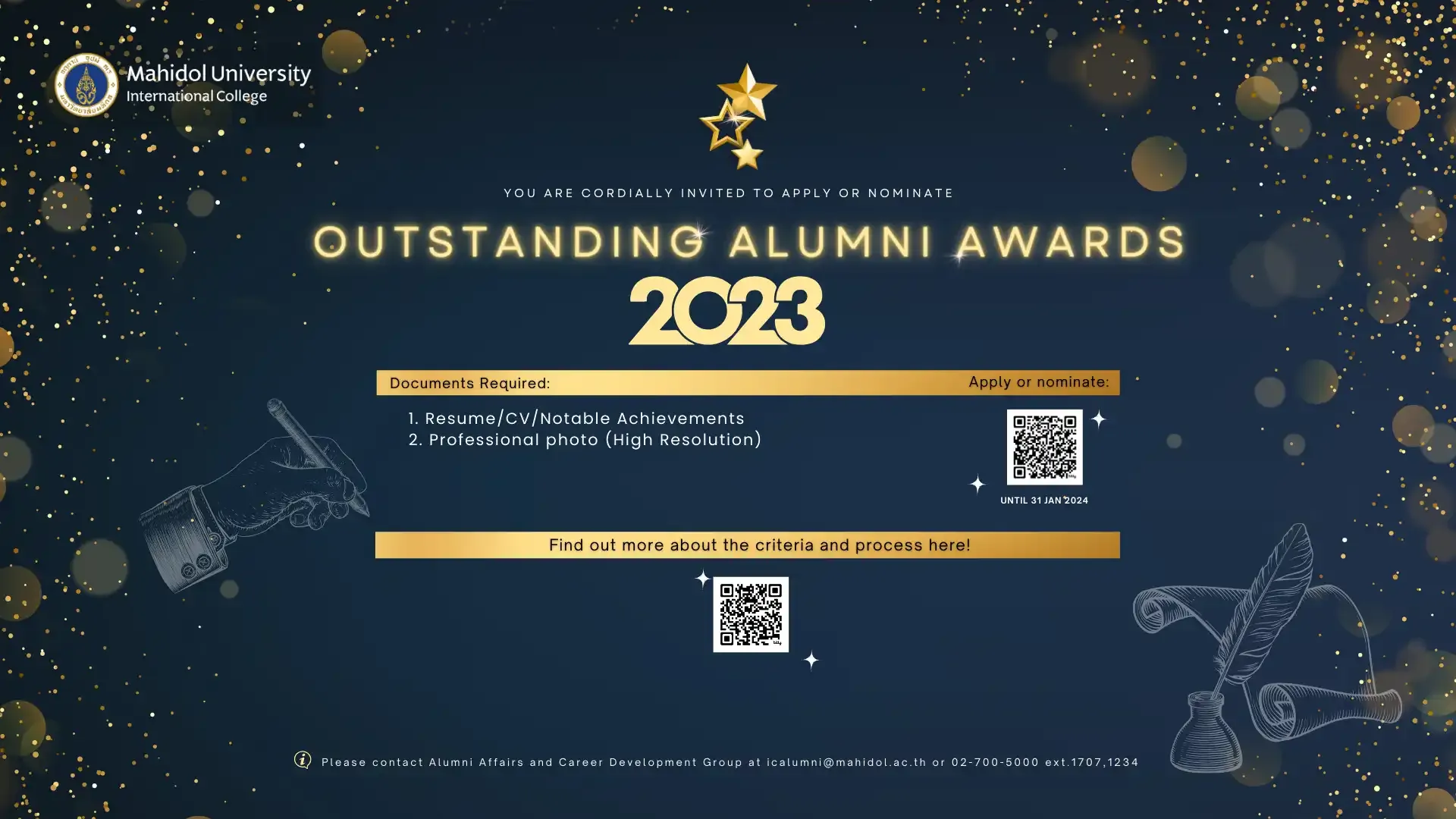 Mahidol University International College (MUIC) is initiating the Outstanding Alumni Award Program to recognize the exceptional contributions to society of MUIC alumni. We would like to encourage you to apply or nominate the MUIC Outstanding Alumni Award 2023. Outstanding Alumni are classified into five (5) different categories as outlined below:
