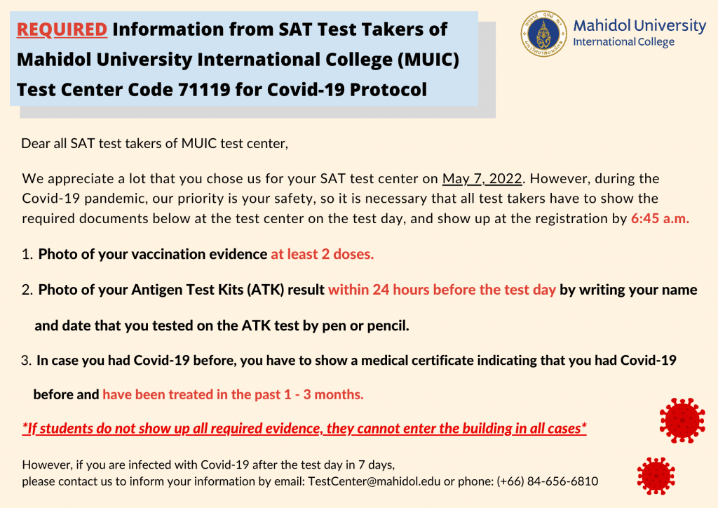 MUIC SAT test center will operate SAT test center on May 7, 2022 by following Covid-19 prevention protocol. All test takers should show up at the registration by 6:45 a.m. The test center requires the following evidence from all test takers