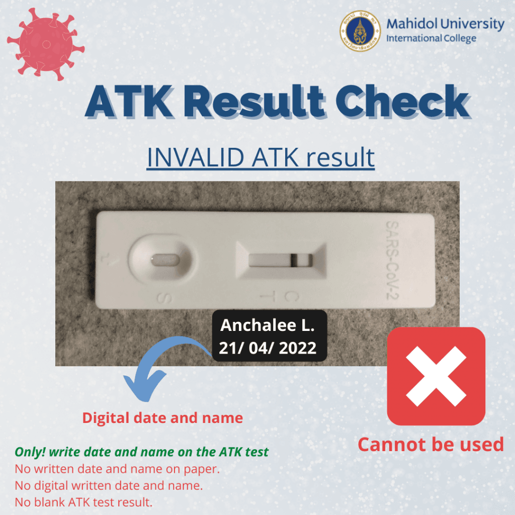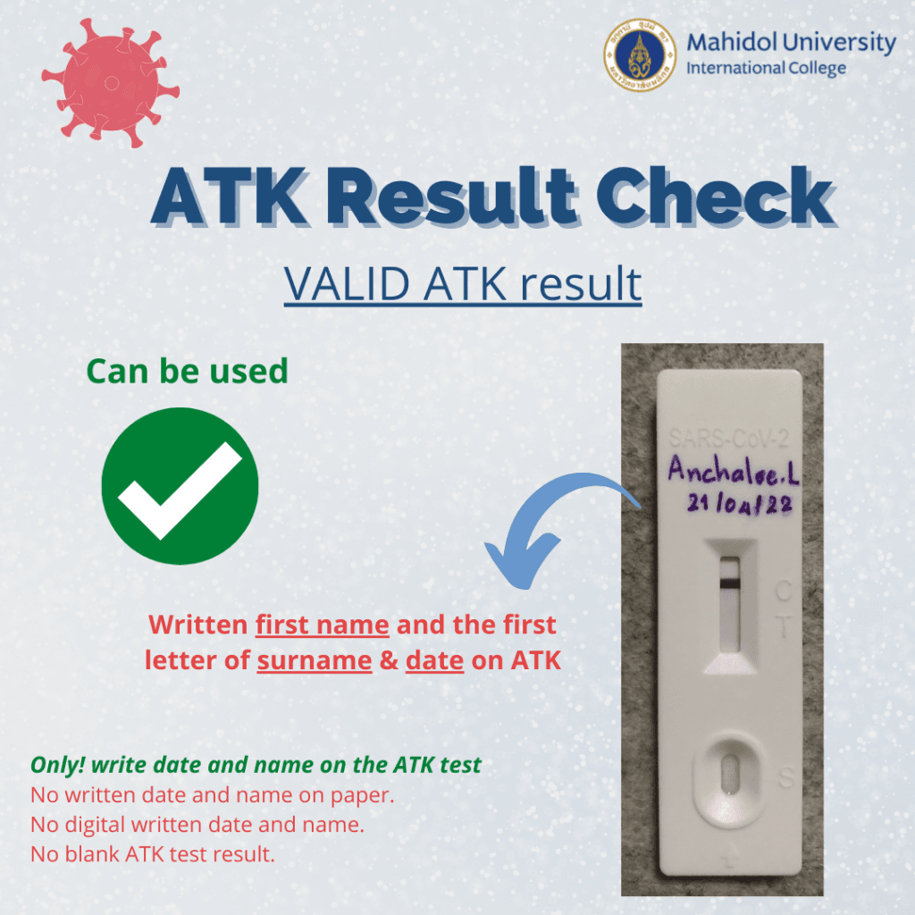 2.      Photo of your Antigen Test Kits (ATK) result within 24 hours before the test day by writing your name and date that you tested on the ATK test by pen or pencil.