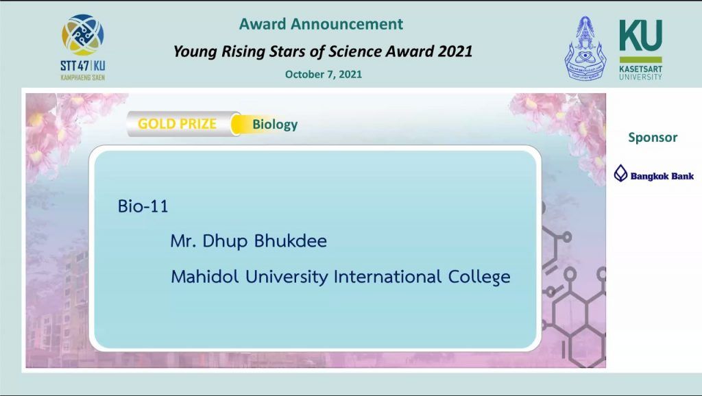 Five students of Mahidol University International College (MUIC) received the Young Rising Stars of Science Award 2021(Gold Prize) for their respective senior research projects in the 47th International Congress on Science, Technology and Technology-based Innovation held online and at Kasetsart University Kamphaeng Saen Campus on October 5-7, 2021.