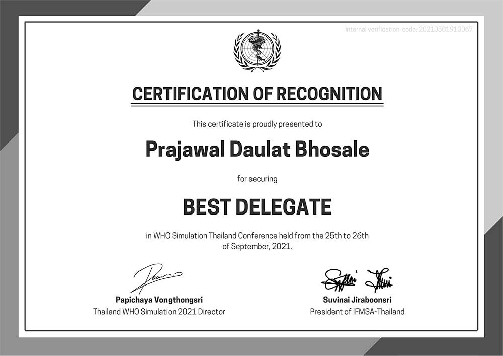 Ms. Prajawal Bhosale, a student in the International Business program, received the “Best Position Paper” and “Best Delegate” awards at the WHO Simulation 2021 Thailand Conference held online on September 26, 2021.