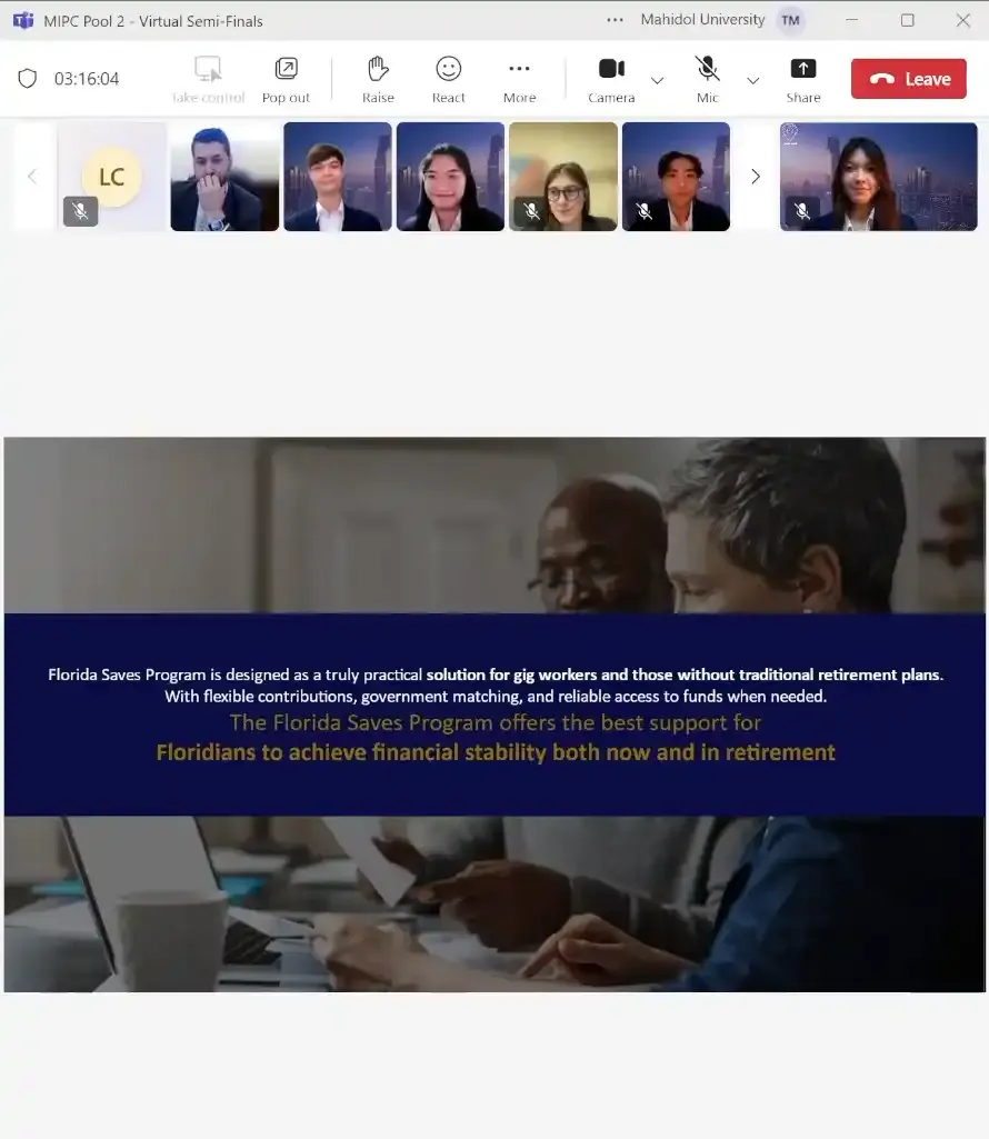 Each member brought a strong foundation in finance, which they applied towards designing an innovative solution for enhancing retirement security for gig workers in Florida. Their proposed solution, the "Florida Save" initiative, incorporated a dual-account model to balance short-term liquidity with long-term retirement savings, catering to the financial needs of gig economy workers.