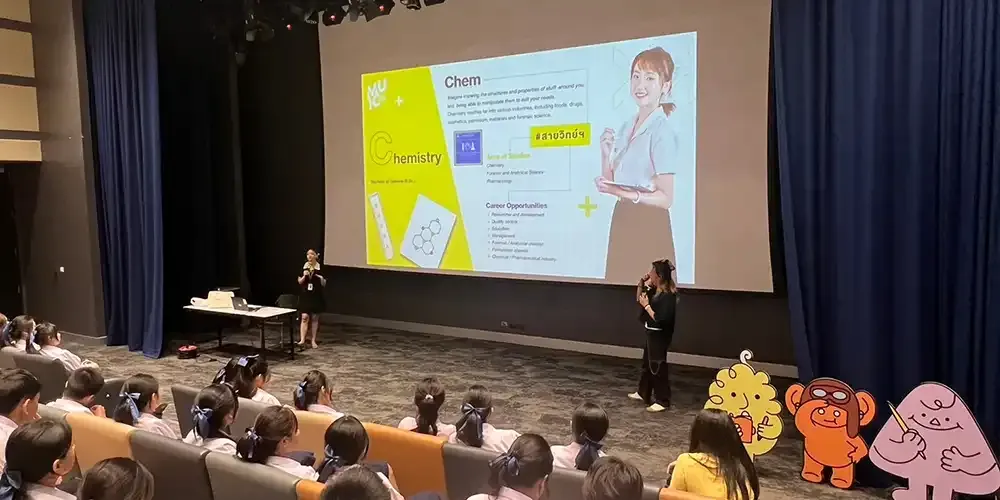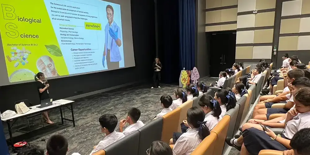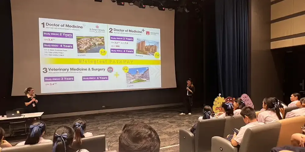 MUIC staff members and representatives from the academic divisions met the students at the Screening Room, Room A556 in Aditayathorn Building, where the high school students learned much about MUIC’s international programs and admissions procedure which will be helpful for their plans to apply for university. There was also a Q & A session at the end.
