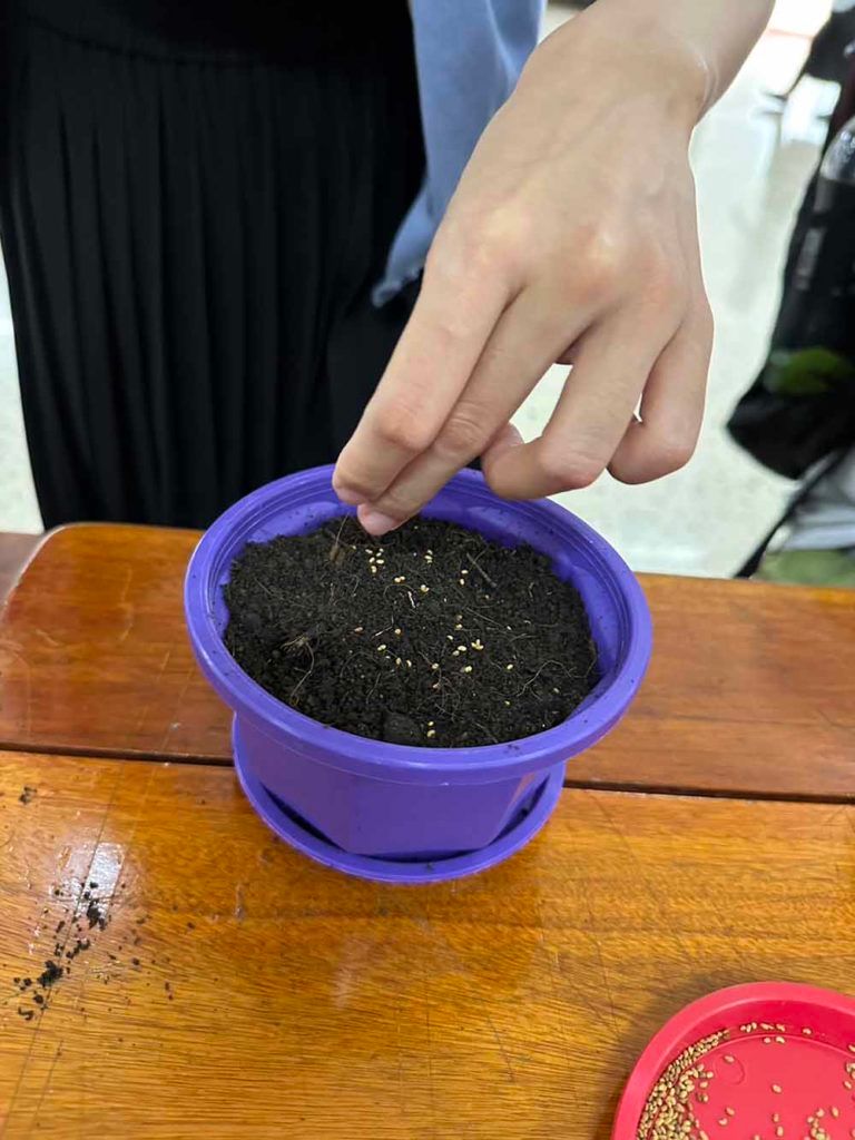 In the second part of the activity, the participants put the compost in their plant pots. Then, they spread the seeds of alfalfa, a type of microgreens, onto their compost. After the alfalfa grew, it can be collected and made into food.