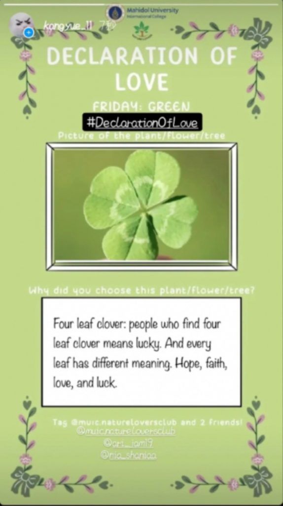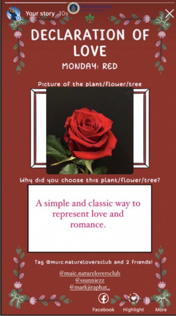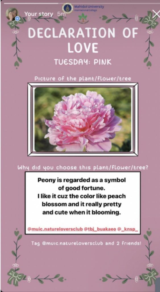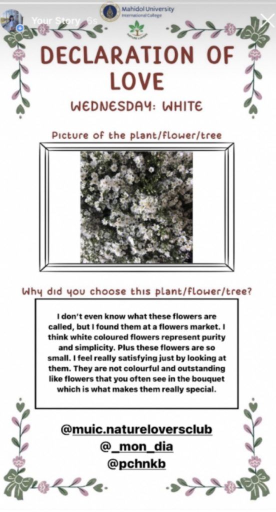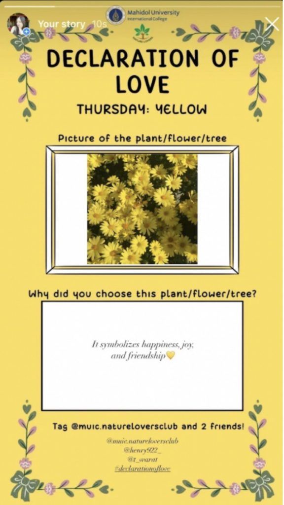 In this contest, the club provided five themes of color for five different days. The participants were then asked to post an image of their favorite plant, tree or flower that corresponds to the color of that day on their Instagram Story and tag the Nature Lovers Club Instagram page and two of their friends, adding the #DeclarationOfLove. A random generator then picked one winner each day who won a 300 Baht cash prize and also 1 AT Hour in Environmental Literacy and Digital Literacy.