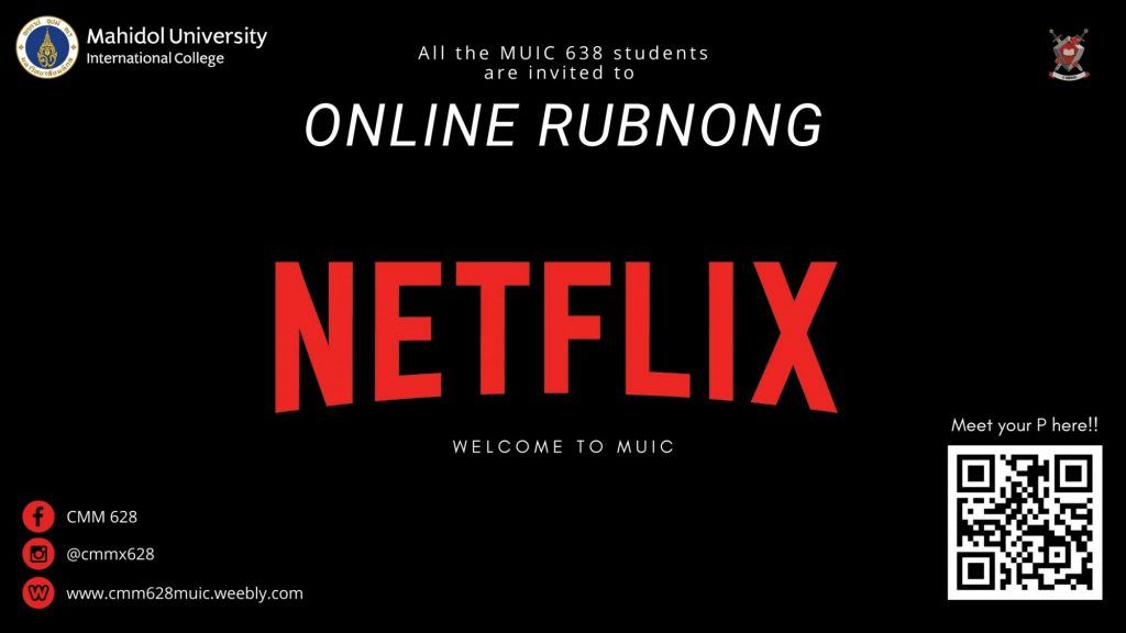 Ever since the outbreak of Covid-19, “rubnong” activities cannot be held on campus, however to preserve this valuable tradition which helps form strong bonds between freshmen and sophomores, the Class Committee of MUIC 628 (CMM628) staged it through the online platform. CMM628 created a website for freshmen to easily access “rubnong” activities and meet their sophomores: https://cmm628muic.weebly.com