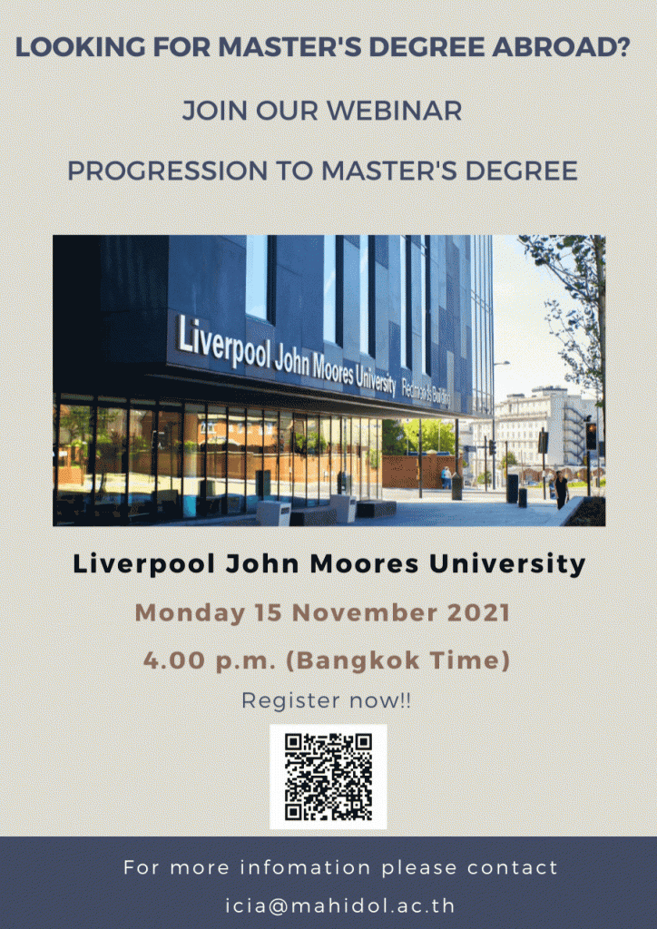 The International Affairs is pleased to invite you to join a webinar for progression to Master's degree at the Liverpool John Moores University , UK. Learn more about the master’s options and scholarships for MUIC students. Details as follow.