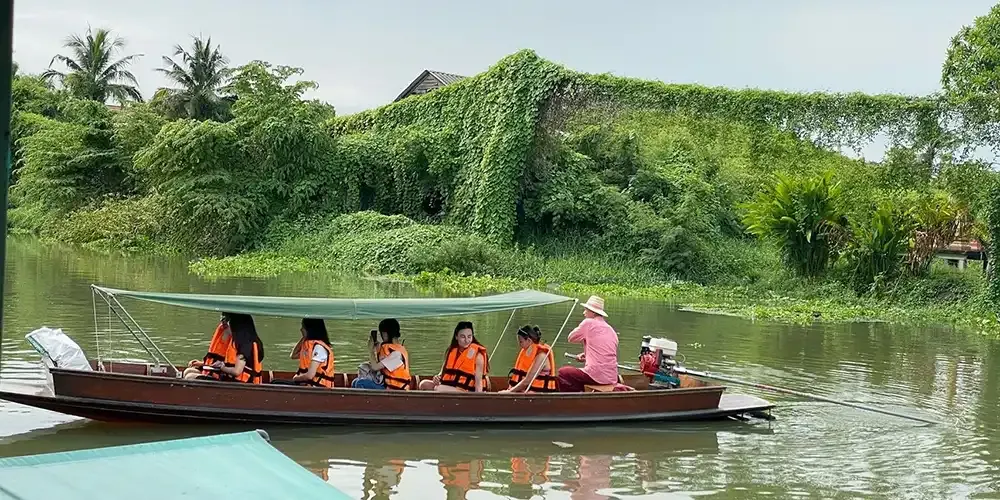 The club took 21 students to explore Baan Saladin and experience life at the local community through four main activities. These were taking a boat trip to a lotus pond at Baan Na Bua, visiting Suwannaram Temple to see the Buddha statue and feed food to the fish in the canal next to the temple, visiting spring bitter cucumber house and trying some snacks and products from this type of fruit, and making a Thai snack called “khao thang” at Baan Khao Thang.