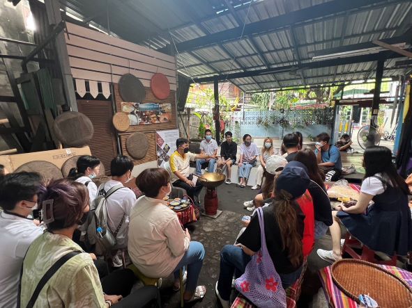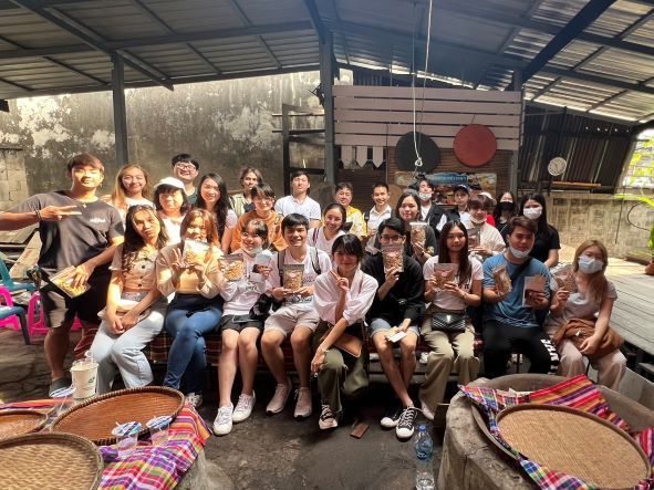 The 15 student participants had the opportunity to learn much about the Bangkok Noi community. This included getting to know the local people in Khao Mao Alley and learning how to make “khao mao mee,” a traditional Thai dessert. During the tour, the students observed how local people live in the Ban Bu community. They also participated in making “khan long hin” or stone-polished bronze bowls, a type of Thai bronze ware that has a 200-year history. Ban Bu is regarded as the last place that produces this unique bronze ware. Furthermore, the participants were able to visit Wanglang Market, a popular market in Bangkok Noi.