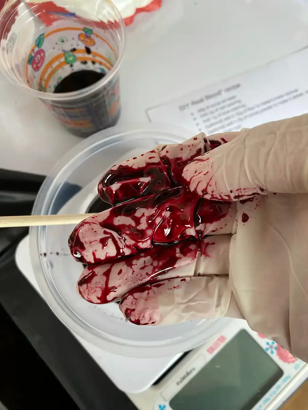 Held at the Dice Hall, 2nd Floor, Aditayathorn Building, the event allowed students to craft realistic-looking fake blood from everyday household ingredients: cane syrup, food coloring, and flour. Under the guidance of club committee members, participants learned about the chemical properties that give fake blood its life-like appearance. They also had hands-on experience in achieving different colors and consistency by mixing their own ratio of the syrup, coloring, and flour.
