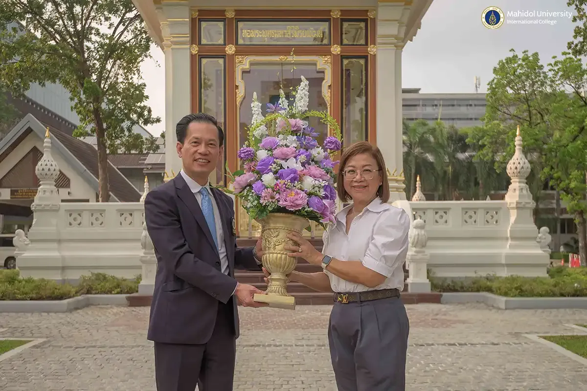The Mahidol University International College (MUIC) executive team led by Assoc. Prof. Dr. Yingyot Chiaravutthi, Associate Dean; Assoc. Prof. Dr. Chanchai Phonthanukitithaworn, Associate Dean for Corporate Communication and Information Technology; and AjarnWimonsiri Hemtanon, Associate Dean for Student Affairs; accompanied by Prof. Dr. Nopraenue Sajjarax Dhirathiti, Vice President for Global Partnerships and University Council of Mahidol University, and a faculty member of the Social Science Division of MUIC, along with staff members, laid a royal Pan-Pum (a traditional floral arrangement) in front of the statue of His Royal Highness Prince Mahidol of Songkla as part of paying obeisance to him and also in observance of the 57th Anniversary of the Royal Bestowal of the University Name and the commemoration of Mahidol University’s 138th Anniversary, on March 2, 2026 at the Office of the President.