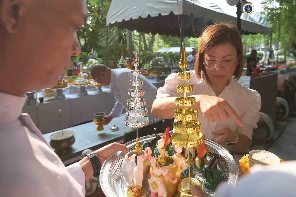 To mark the 39th Anniversary of the establishment of Mahidol University International College (MUIC) and celebrate its achievements, the college’s executives, faculty members, and staff led by Prof. Chulathida Chomchai, M.D., MUIC Dean, held two spiritual activities. The first one, held early in the morning of March 26, 2025, was a merit-making ceremony which paid homage to Phor KhunThung Shrine, a revered sacred site within Mahidol University’s Salaya campus. This was followed by a Buddhist ceremony officiated by ninemonks at the Ground Floor, MUIC Building 1. Mahidol University officials also attended both events.